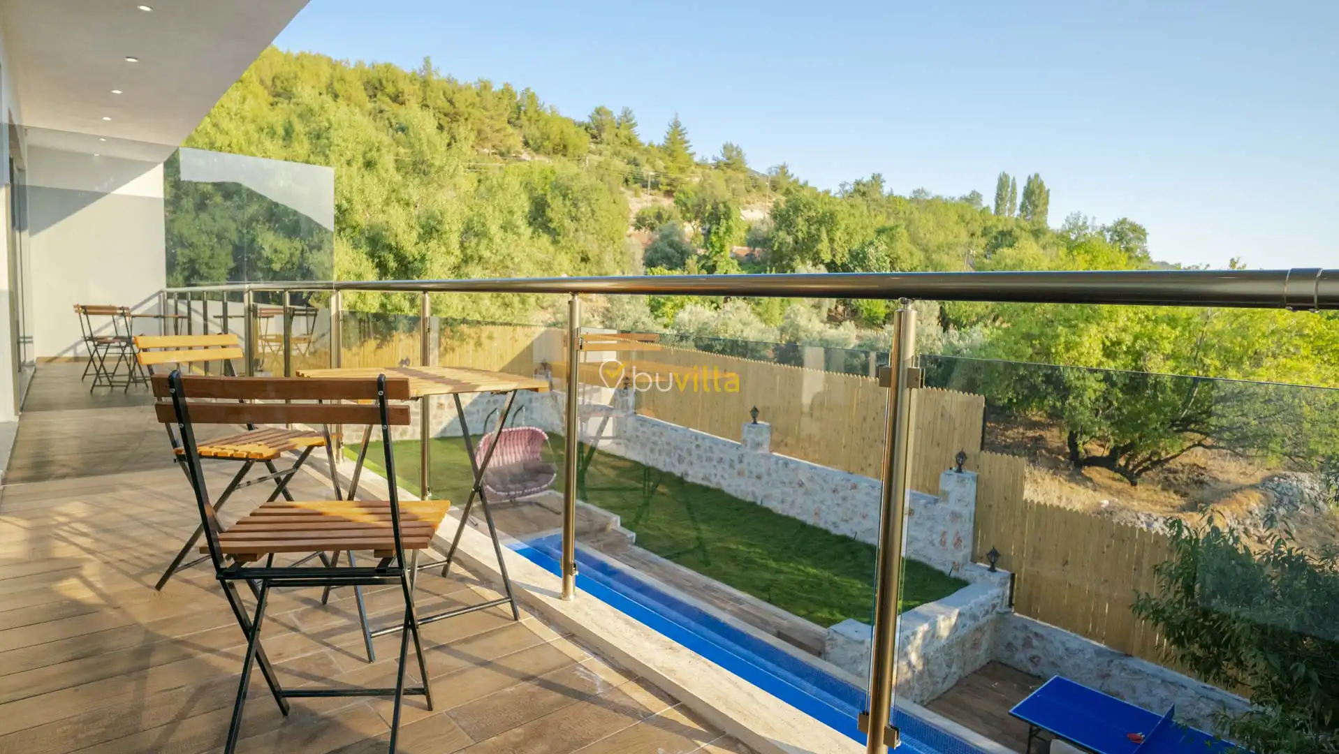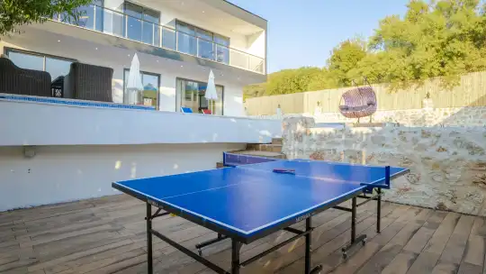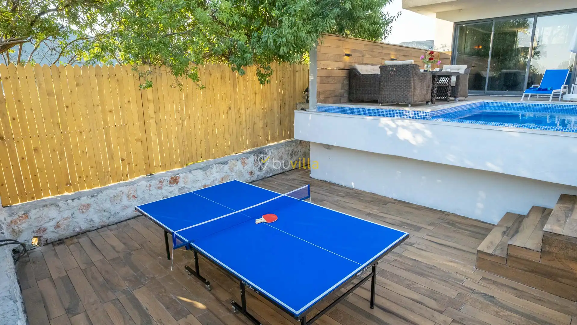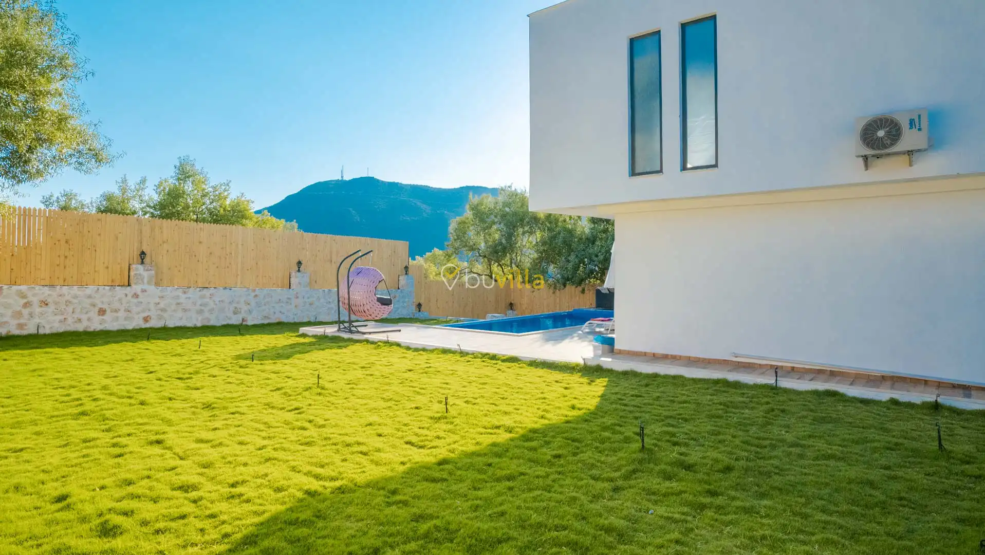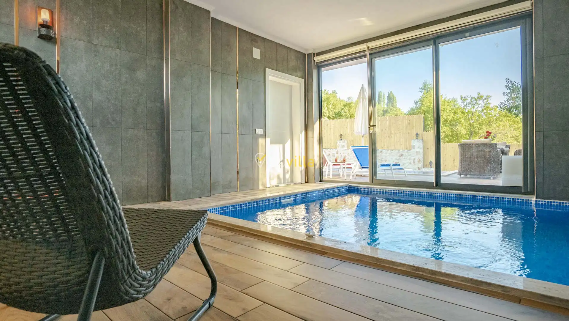 Korunaklı ve geniş bahçe alanında; özel yüzme havuzu, şezlonglar, güneş şemsiyeleri, salıncak, oturma köşesi, masa tenisi, yemek masası ve barbekü alanı bulunmaktadır. İç mekânda yer alan jakuzi ve kapalı ısıtmalı havuz, tatilinize ekstra konfor ve keyif katar.