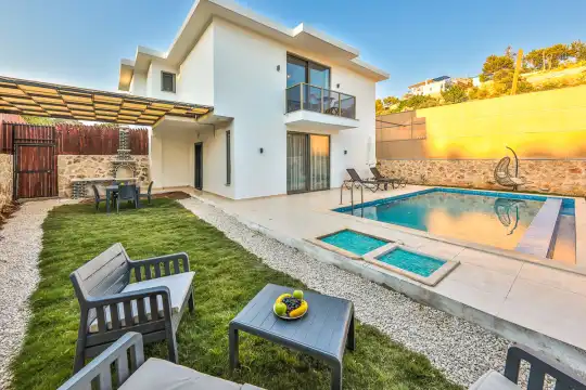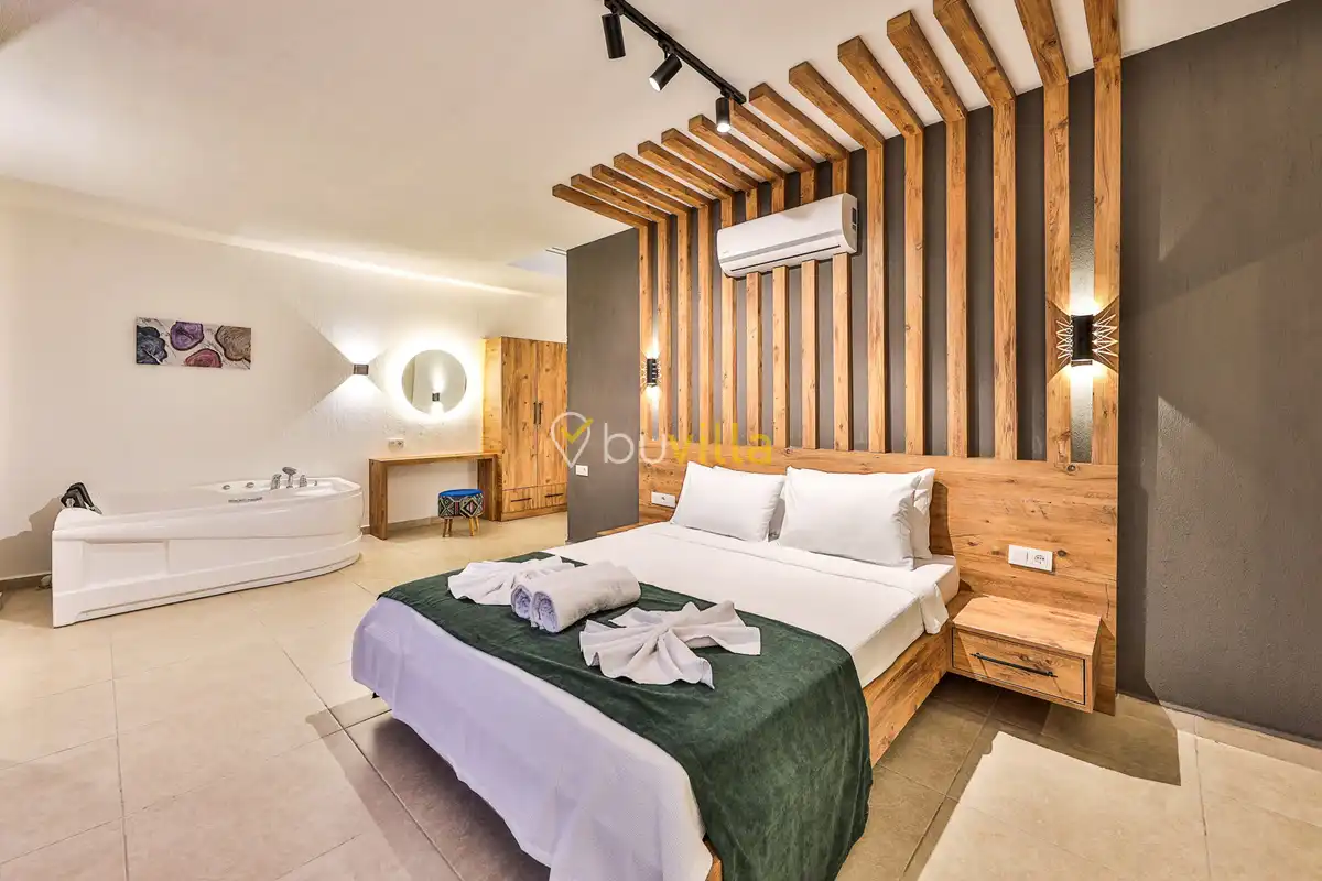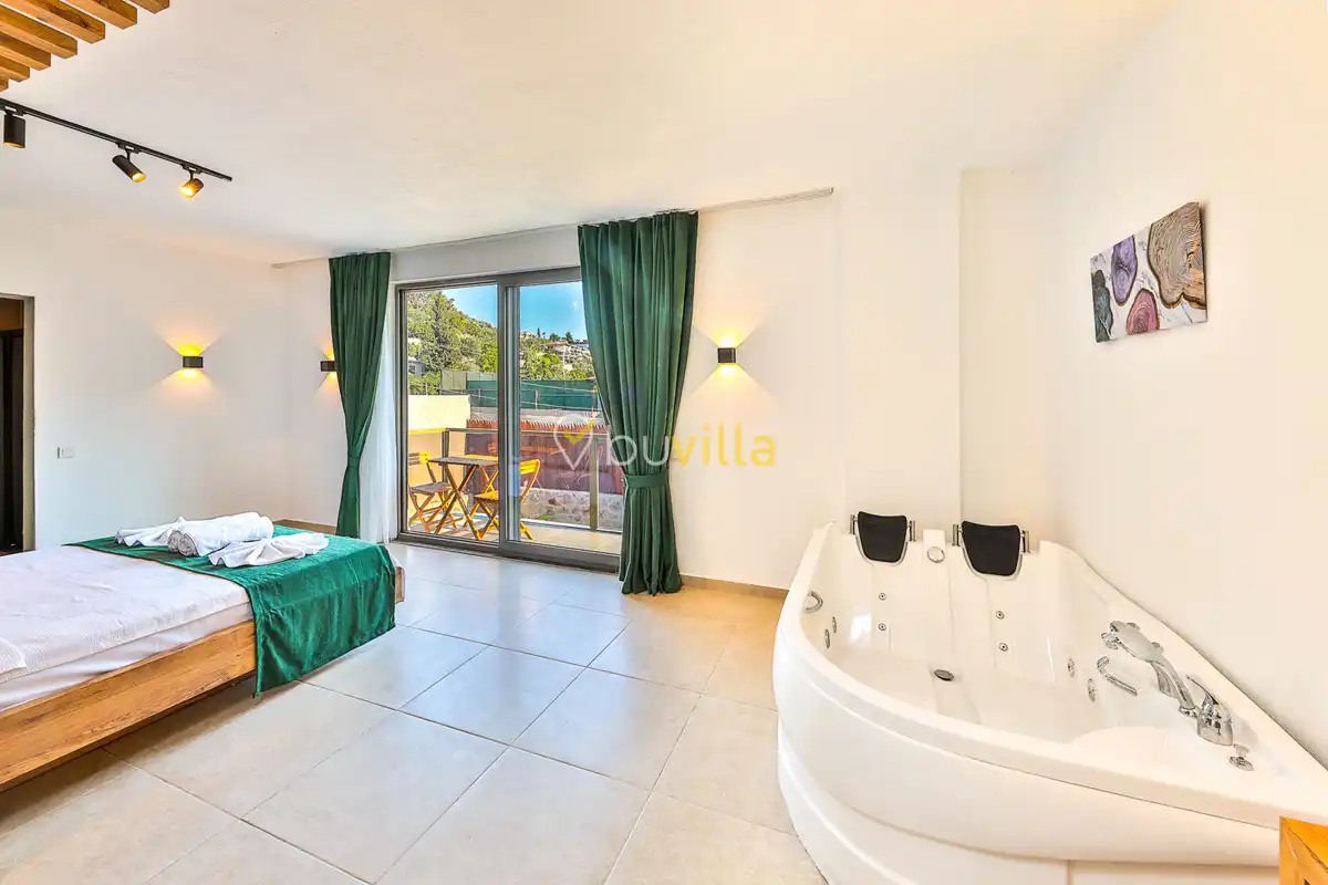Yatak odasında bulunan jakuzi, tatilinize romantik ve keyifli anlar katarken, özel havuzu ve dışarıdan görünmeyen bahçe alanı mahremiyete önem veren misafirler için ideal bir ortam sağlar. Yeni evli çiftlerin beklentileri düşünülerek hazırlanan Villa Perla, balayı tatilinin kusursuz geçmesi için tüm detaylarıyla sizleri beklemektedir.