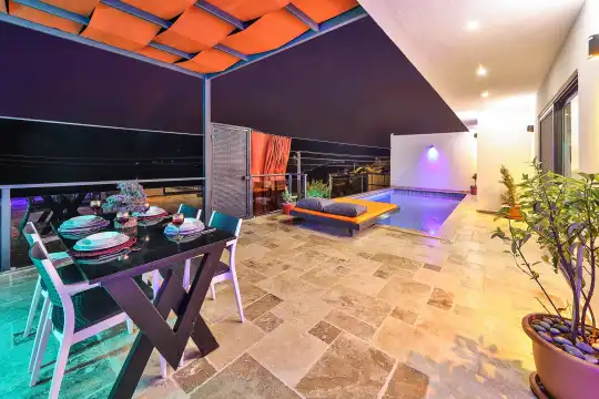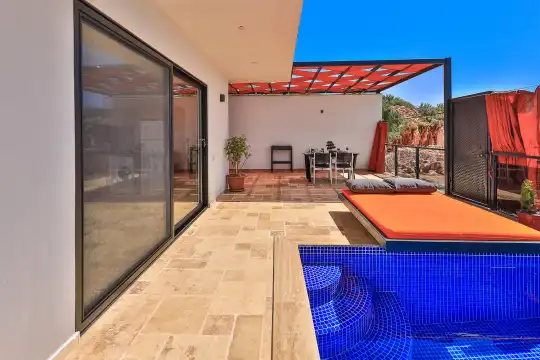 Deniz Manzaralı Villa Kiralık Villa Porto Riko , Kalkan Kördere bölgesinde yer almaktadır. 2 kişiye kadar konaklama imkani sunan villamız balayı çiftleri için ideal bir seçenektir. Amerikan mutfağında ihtiyaç duyabileceğiniz tüm ekipmanlar yer almakta olup konforlu mobilyalarla dizayn edilmiş salonu hizmetinizdedir.