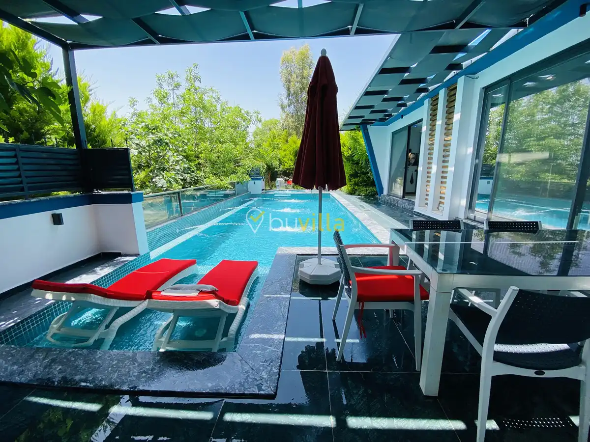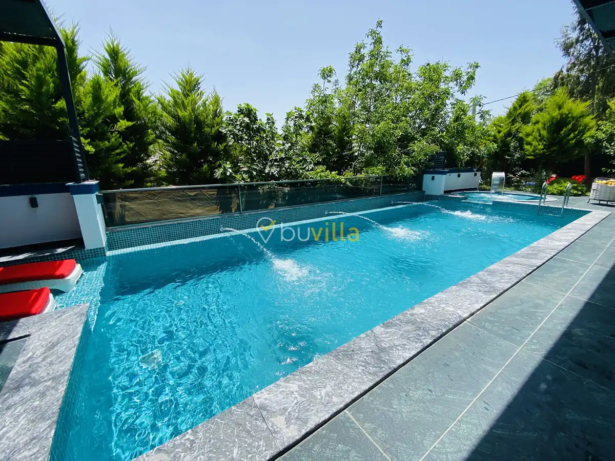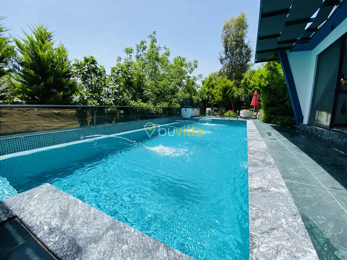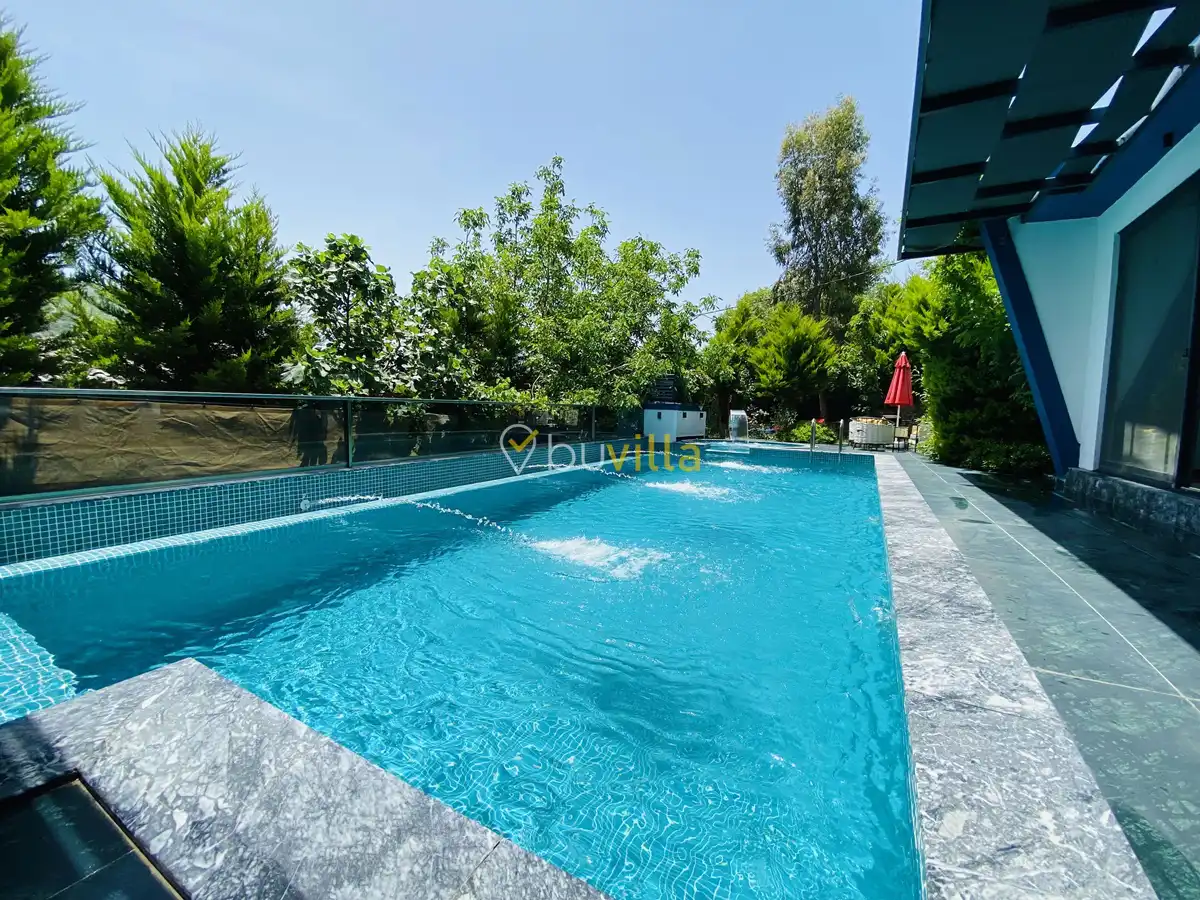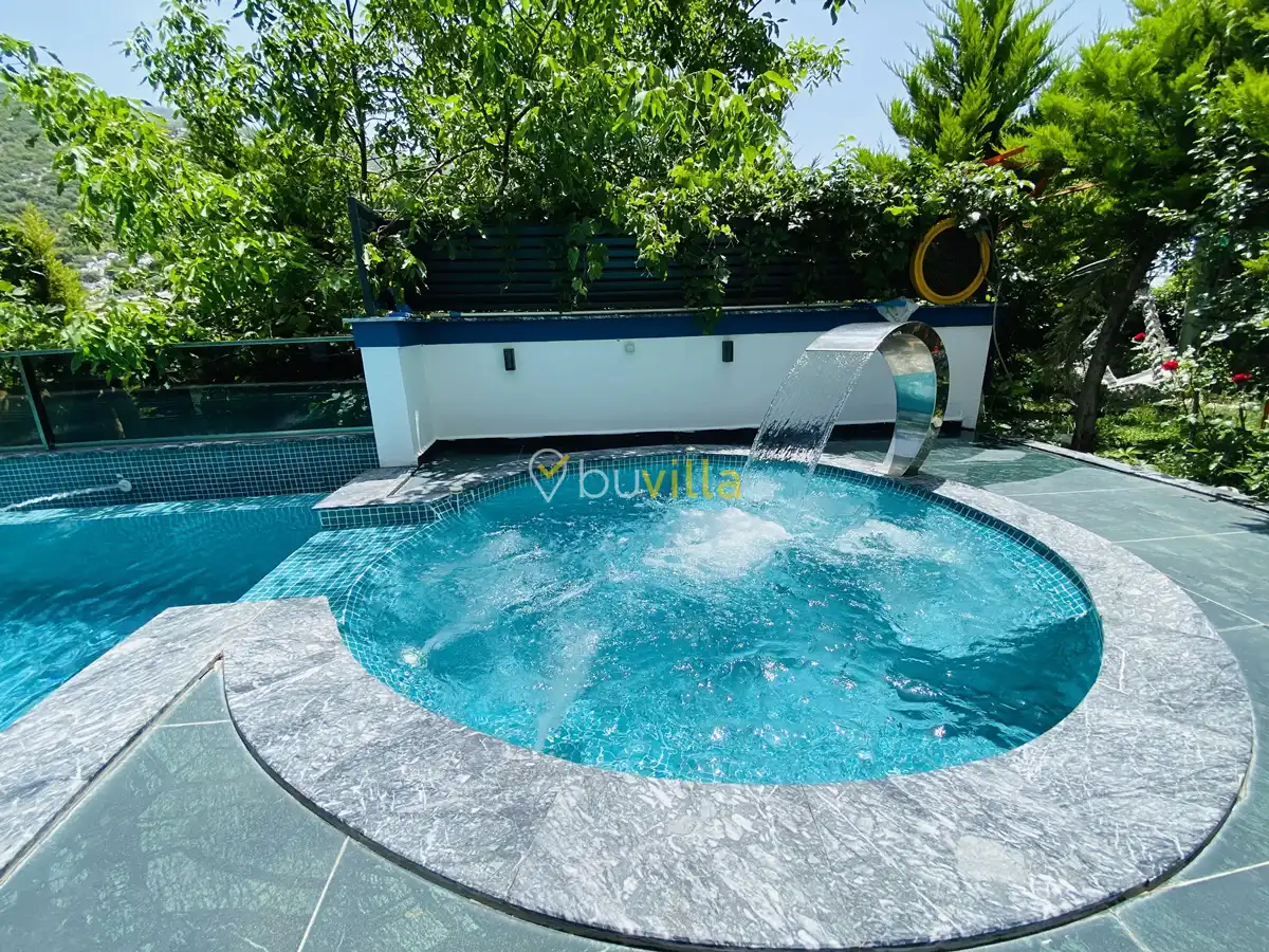 Müstakil yüzme havuzuna sahip olan villamızda, havuzun bir bölümü sığ havuz olarak tasarlanmış olup, yuvarlak formdaki alan ise jakuzi özelliği sunmaktadır. Bu sayede hem keyifli hem de dinlendirici anlar yaşayabilirsiniz.