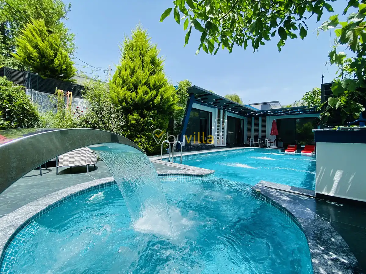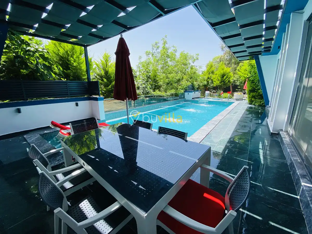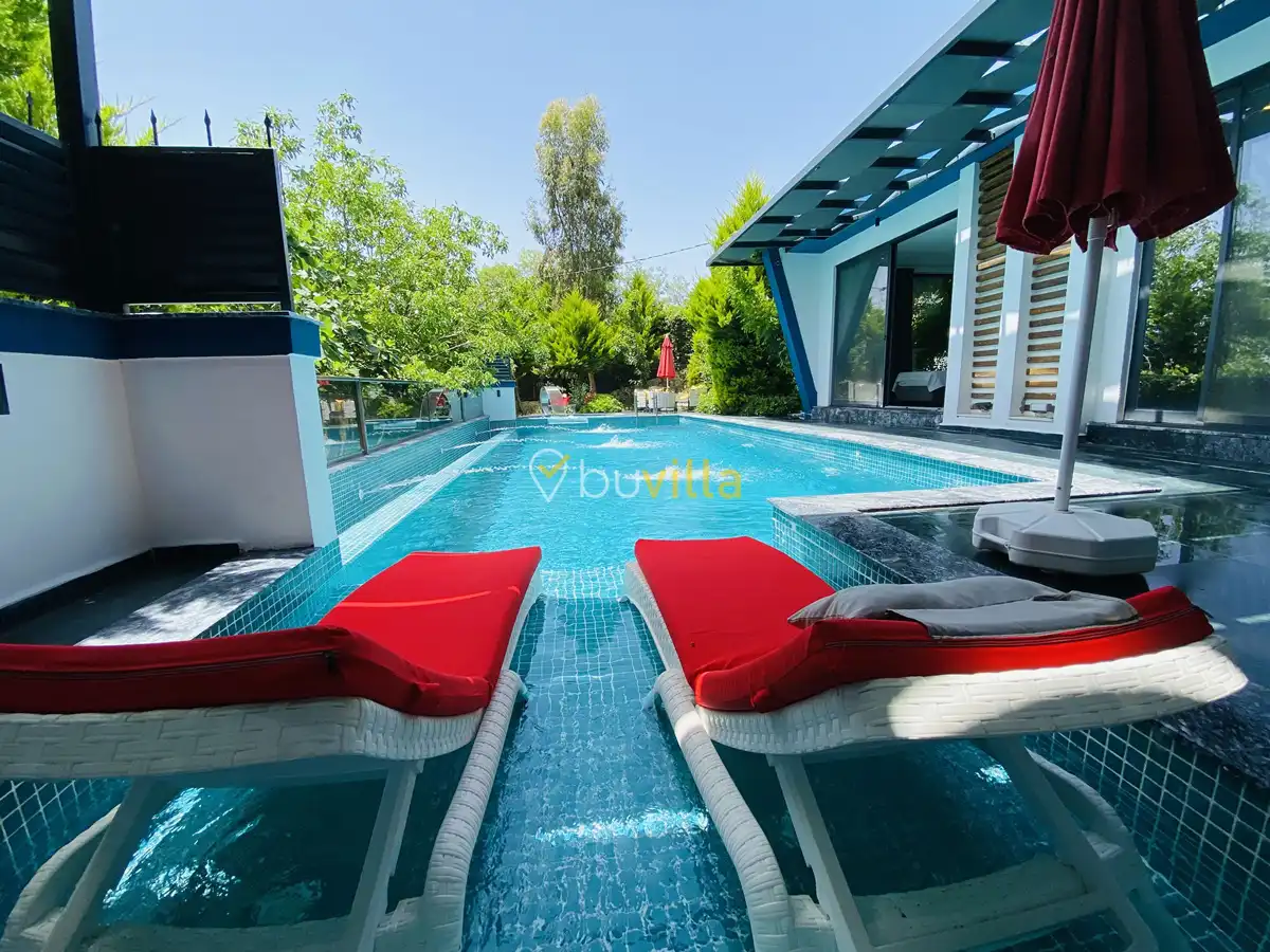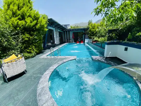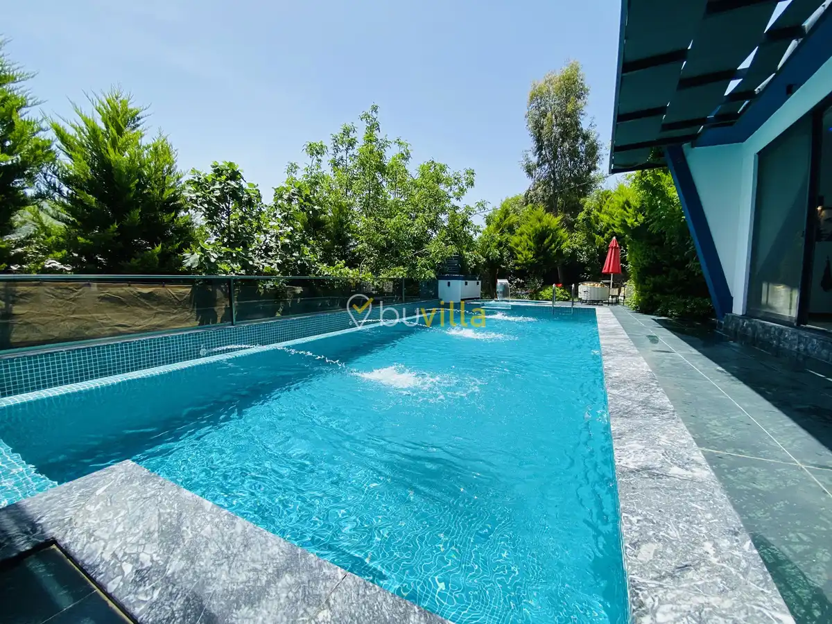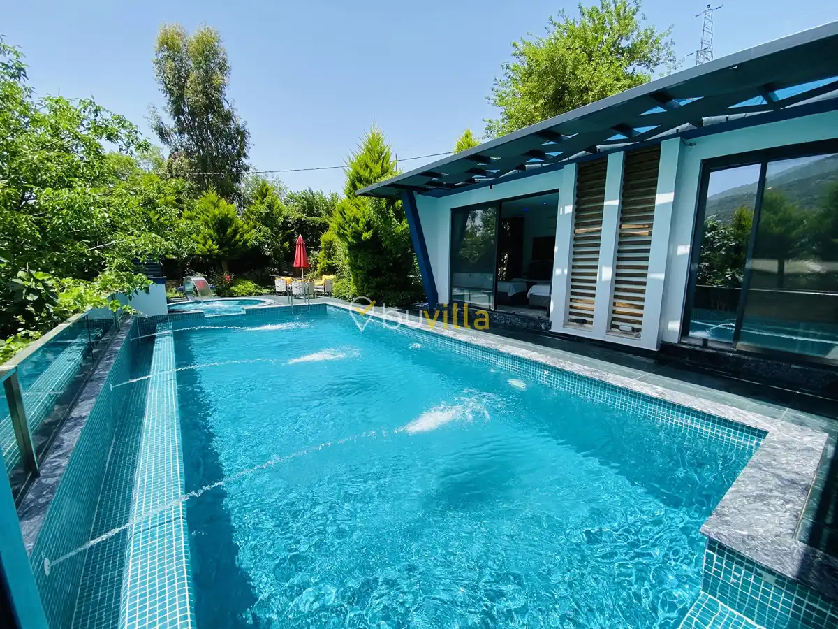 Müstakil yüzme havuzuna sahip olan villamızda, havuzun bir bölümü sığ havuz olarak tasarlanmış olup, yuvarlak formdaki alan ise jakuzi özelliği sunmaktadır. Bu sayede hem keyifli hem de dinlendirici anlar yaşayabilirsiniz.