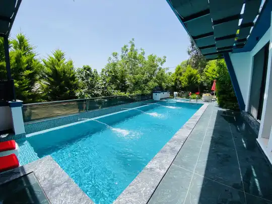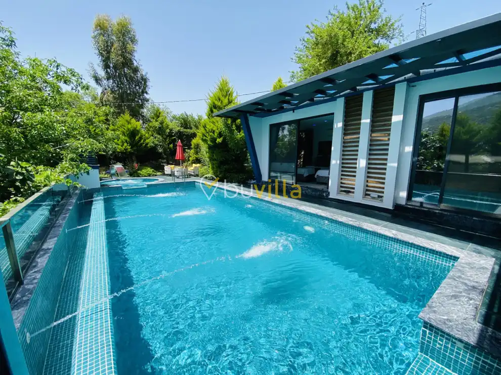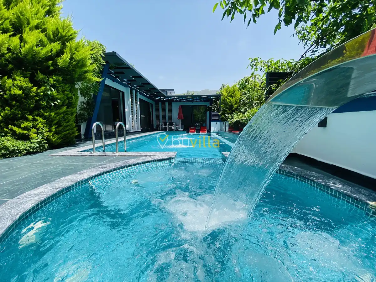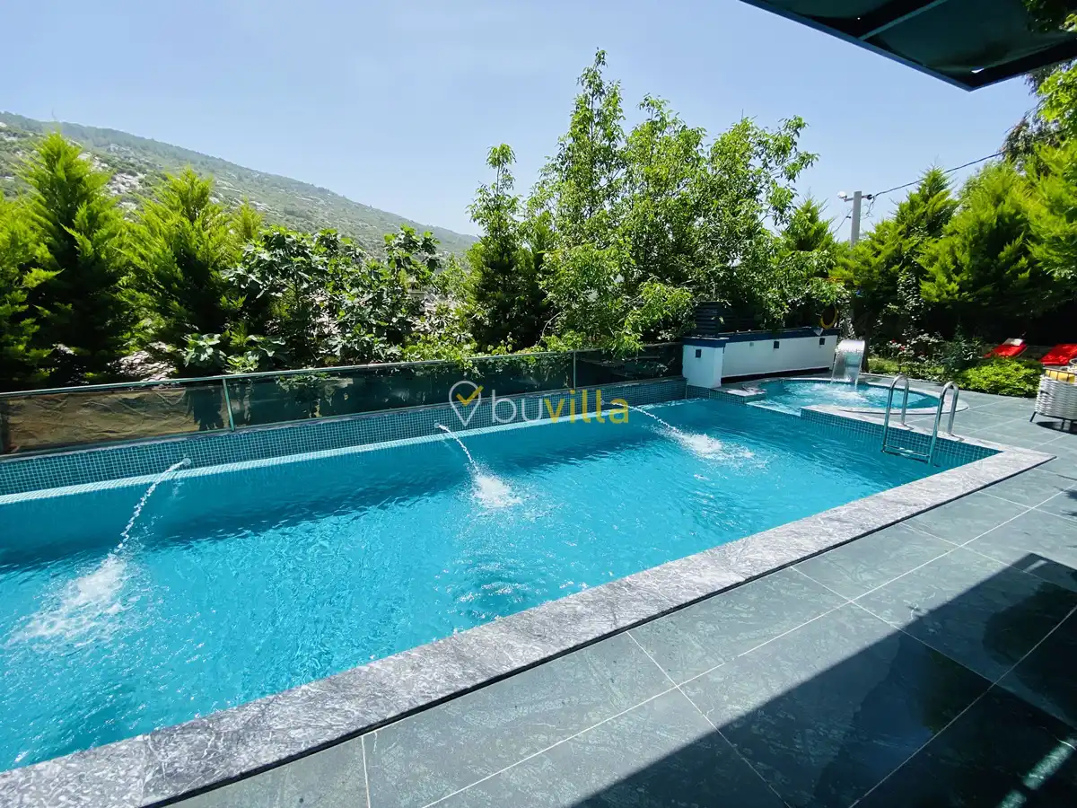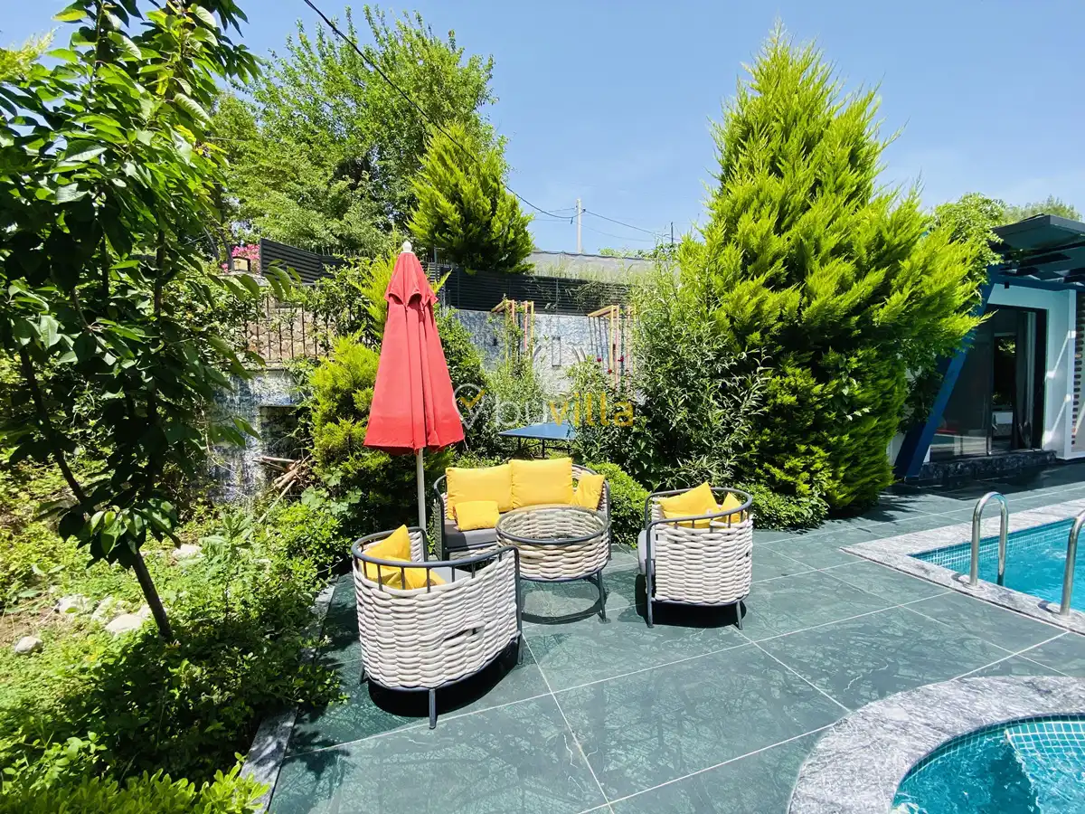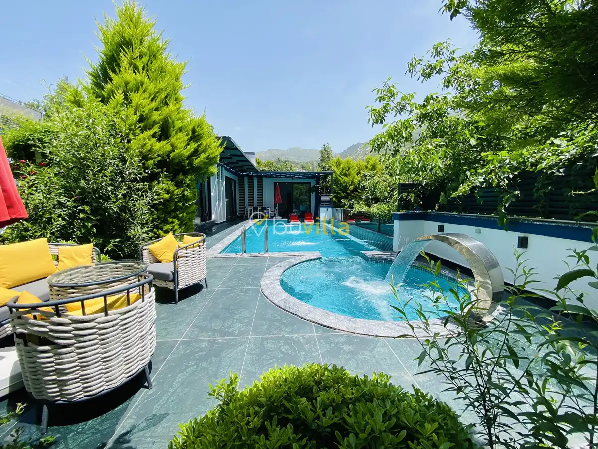 Müstakil yüzme havuzuna sahip olan villamızda, havuzun bir bölümü sığ havuz olarak tasarlanmış olup, yuvarlak formdaki alan ise jakuzi özelliği sunmaktadır. Bu sayede hem keyifli hem de dinlendirici anlar yaşayabilirsiniz.