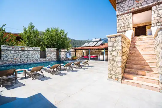 Villa Şah Bezirgan, Kalkan’ın eşsiz doğasıyla çevrili Bezirgan bölgesinde yer alan, 3 yatak odalı ve 6 kişilik konaklama kapasitesine sahip lüks bir villadır. Muhafazakar yapıya uygun olarak tasarlanan villa, taş mimarisi ve şık tasarımıyla dikkat çekmektedir. Isıtmalı havuz, hamam, sauna ve jakuzi gibi konforlu olanakları sayesinde misafirlerine yaz-kış keyifli bir tatil deneyimi sunmaktadır. Doğa ile iç içe, huzurlu ve lüks bir tatil arayanlar için ideal olan Villa Şah Bezirgan, unutulmaz anlar yaşamanız için sizleri bekliyor.