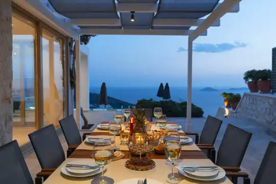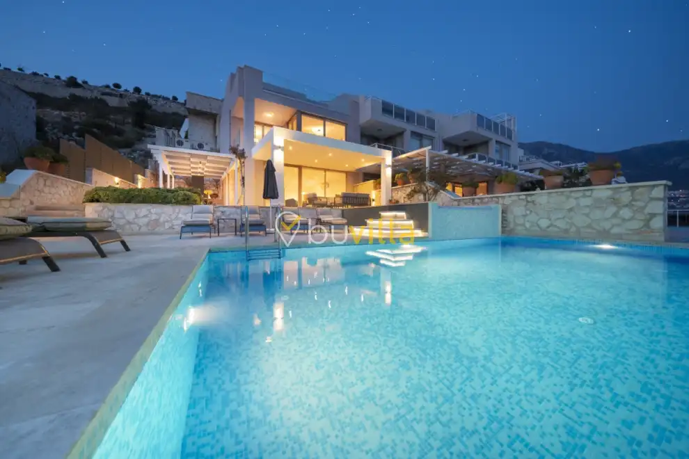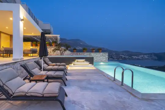 Deniz Manzarali Lüks Villa Kiralik Villa Sarpedonia , Kalkan Kalamar mevkiisinde yer almaktadir. 4 yatak odali 8 kisiye kadar konaklama imkani sunan lüks villamizin havuz ve bahçe kati oldukça genis olup sonsuzluk havuzludur. Villamizin teras katindaki oda nin balkonun da jakuzi yer almaktadir. Tüm odalarinda muhtesem deniz manzarasiyla tatilinizi taçlandiracak kiralik villamizin modern mutfaginda ihtiyaç duyabileceginiz tüm ekipmanlar bulunmakta olup konforlu mobilyalarla dizayn edilmis salonu hizmetinizdedir. Not: Villamizin 4. yatak odasi villa içerisinde olmayip bahçeden ayri bir girisi vardir.