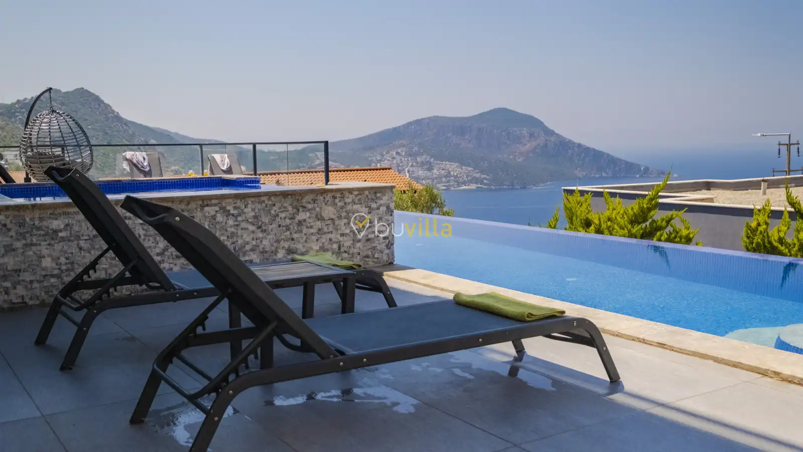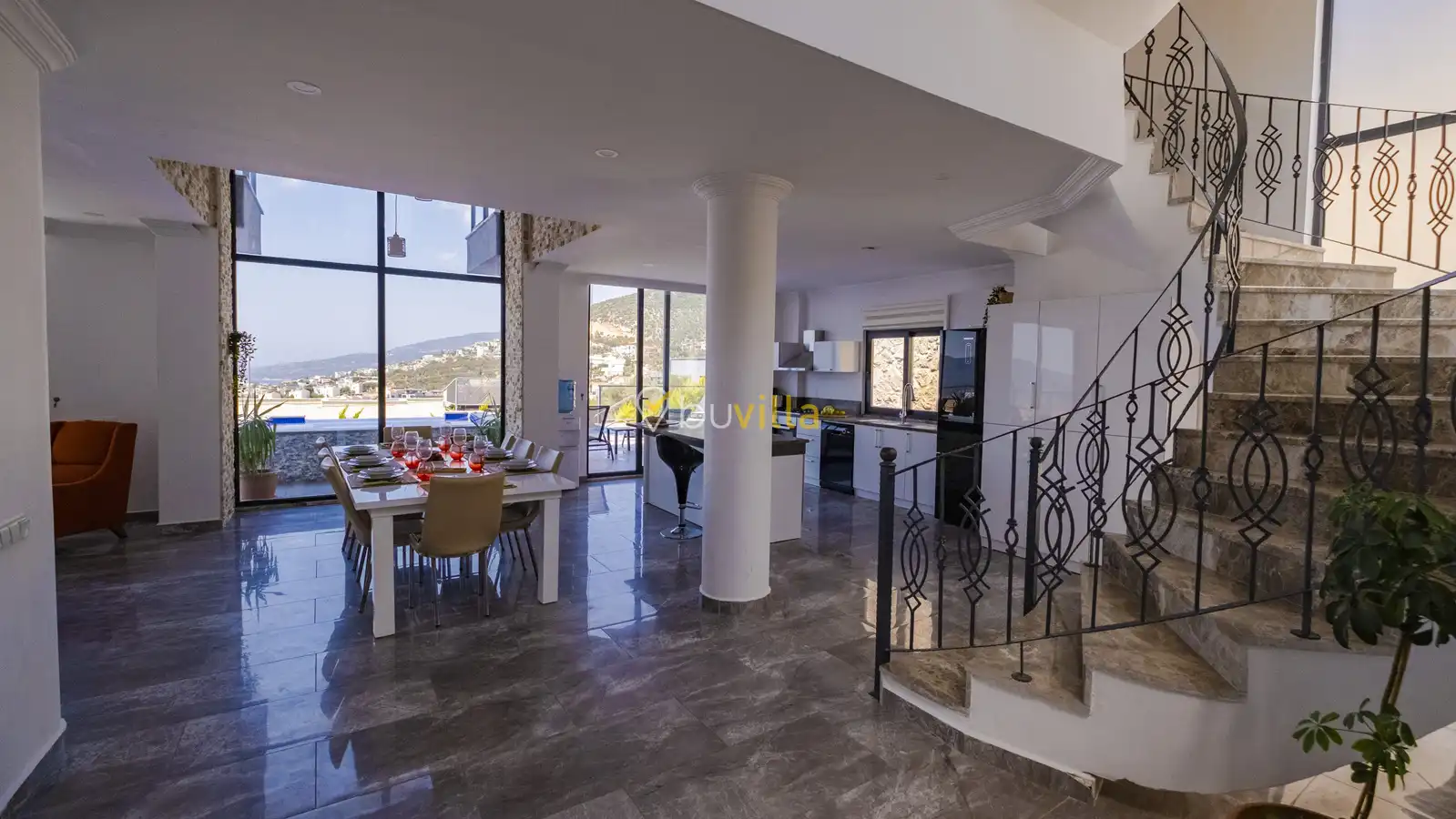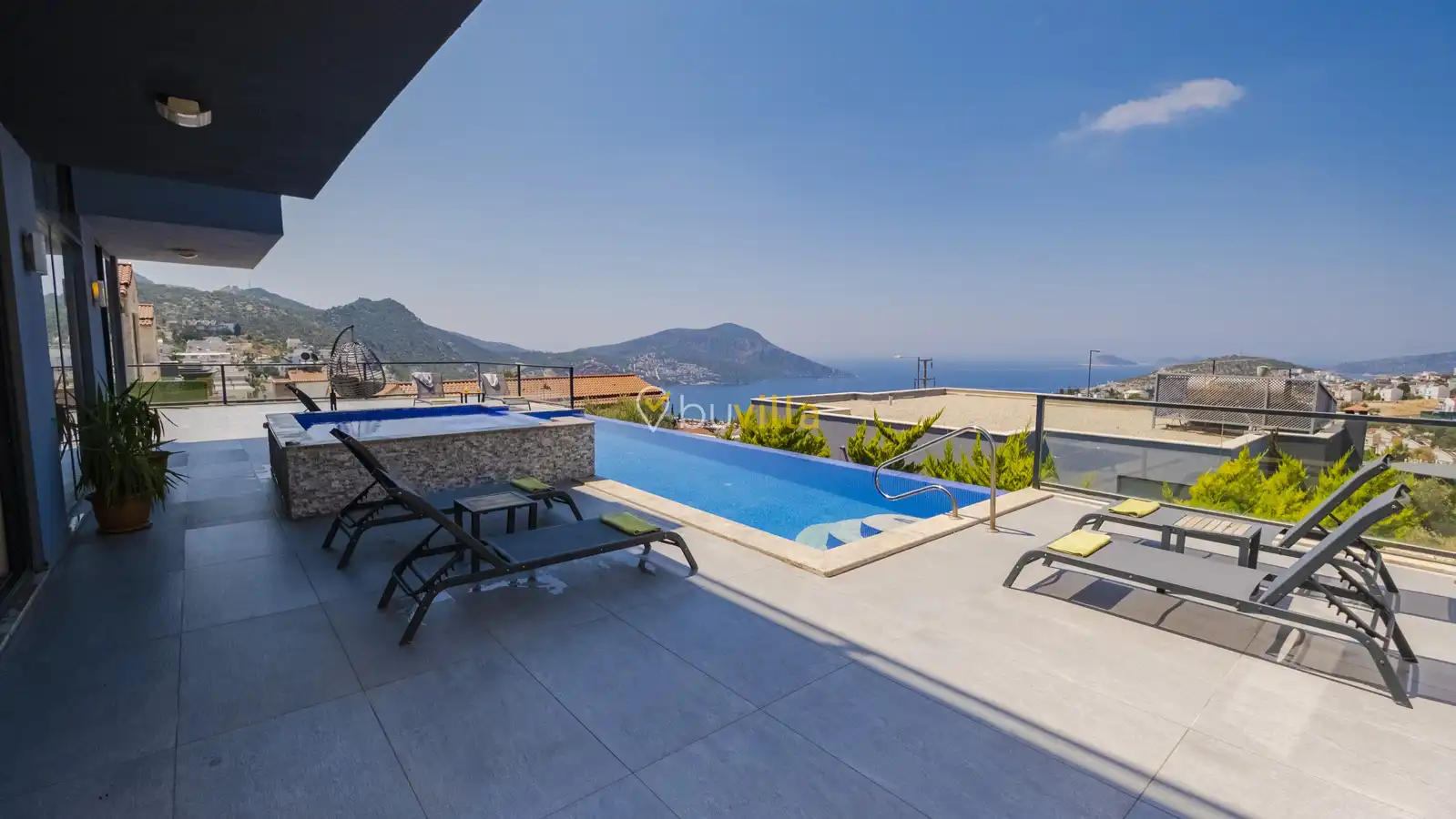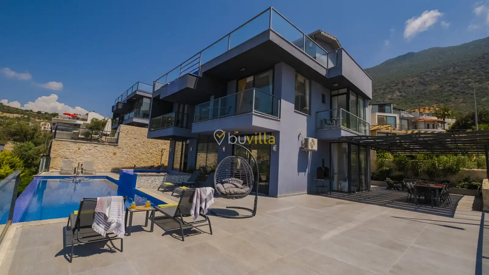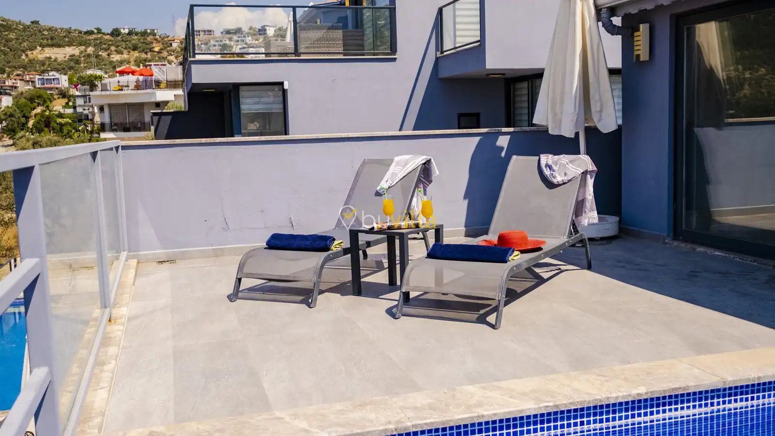 Villanın en dikkat çekici özelliklerinden biri, çatısından süzülen şelalenin zemin kata kadar akarak sonsuzluk havuzuyla buluşmasıdır. Bu özel tasarım, tatiliniz boyunca huzur verici bir atmosfer yaratır. Panoramik deniz manzarasına sahip geniş teras ve sonsuzluk havuzu, Akdeniz’in eşsiz güzelliklerini gözler önüne sererken, güneşlenme alanı ve barbekü köşesi keyifli vakit geçirmeniz için özenle dizayn edilmiştir.