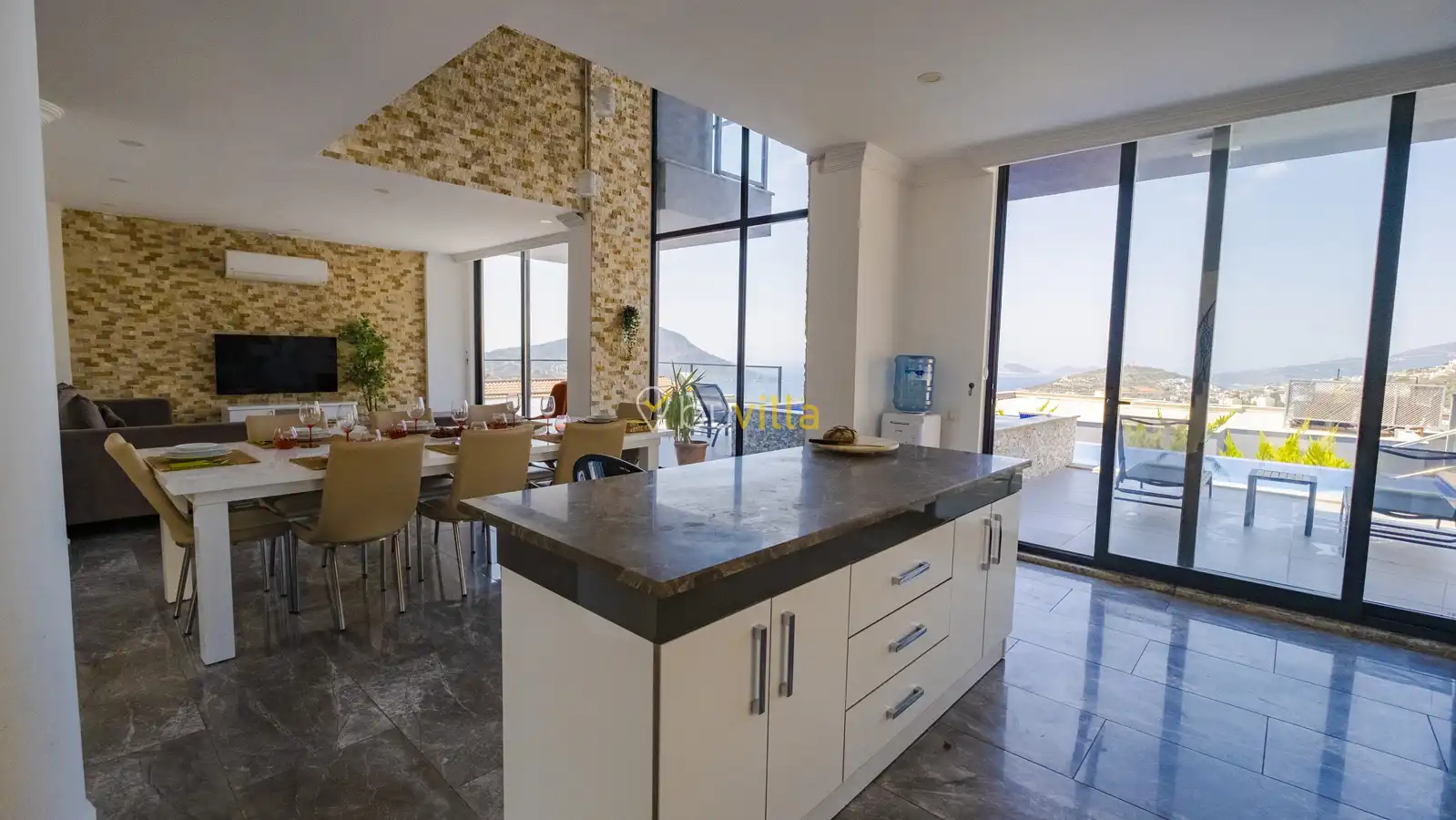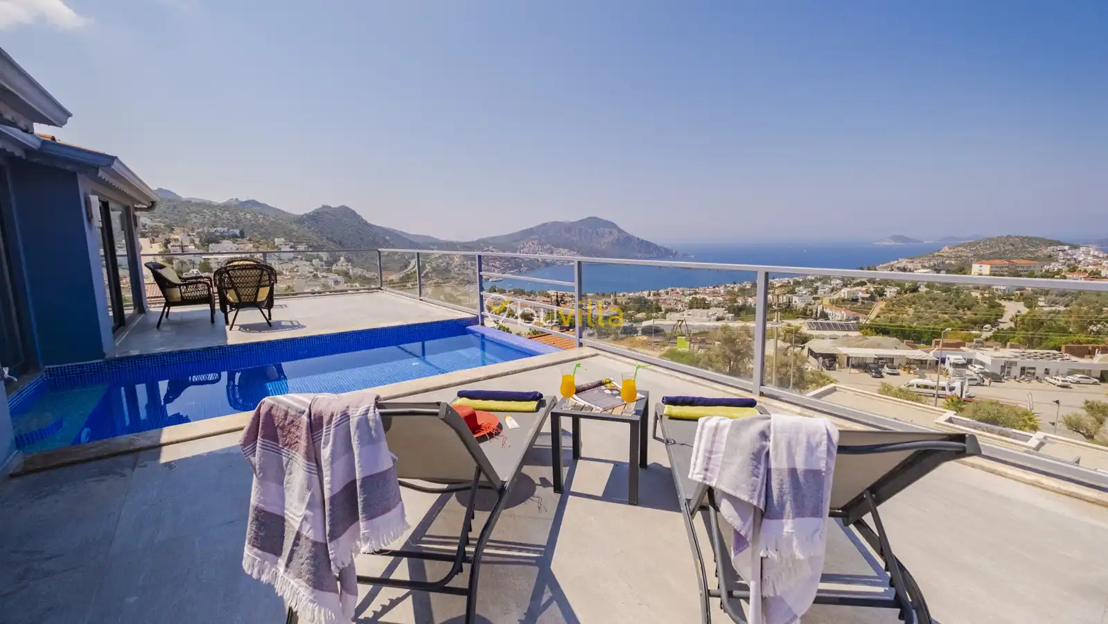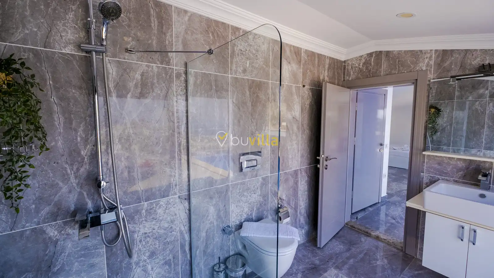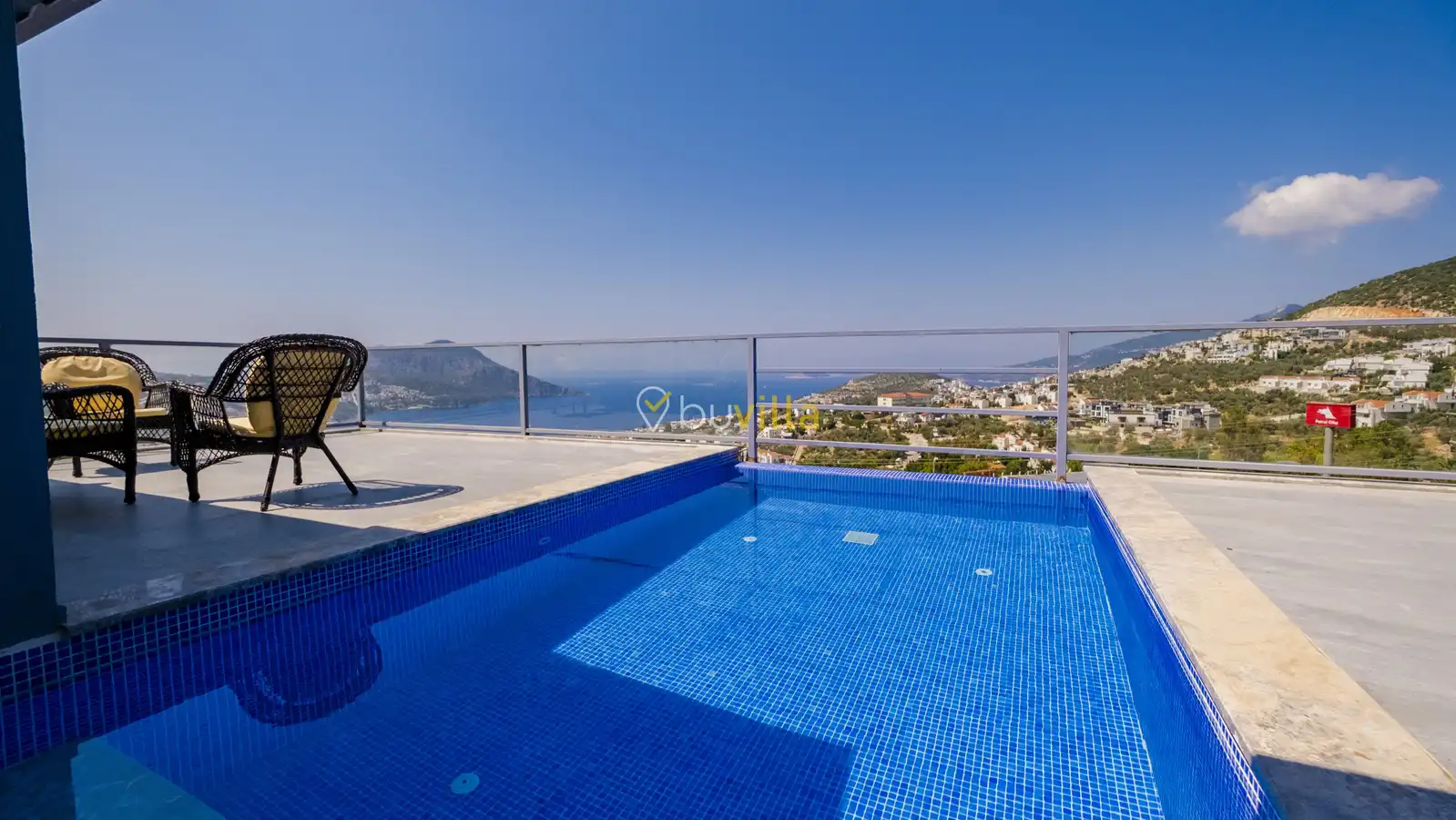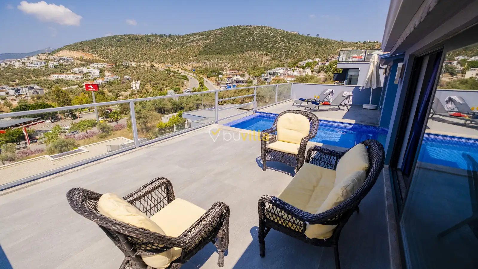 Villanın en dikkat çekici özelliklerinden biri, çatısından süzülen şelalenin zemin kata kadar akarak sonsuzluk havuzuyla buluşmasıdır. Bu özel tasarım, tatiliniz boyunca huzur verici bir atmosfer yaratır. Panoramik deniz manzarasına sahip geniş teras ve sonsuzluk havuzu, Akdeniz’in eşsiz güzelliklerini gözler önüne sererken, güneşlenme alanı ve barbekü köşesi keyifli vakit geçirmeniz için özenle dizayn edilmiştir.