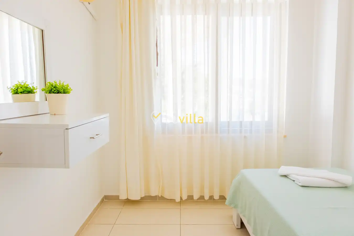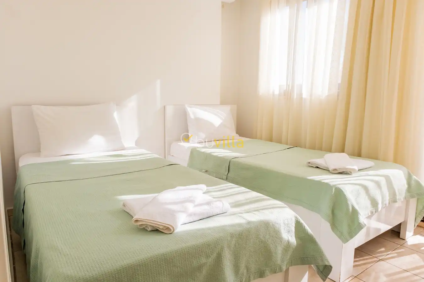 Zemin Kat: İki bağımsız daireden oluşan bu katta her dairede bir Amerikan mutfak & salon, iki yatak odası ve bir banyo/WC bulunmaktadır. Birinci yatak odalarında çift kişilik yatak, ikinci yatak odalarında ise iki adet tek kişilik yatak mevcuttur.