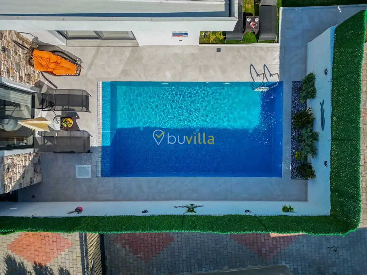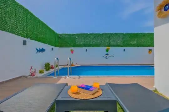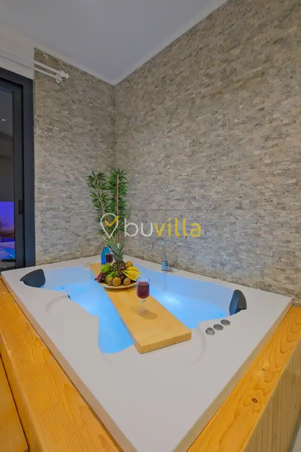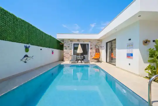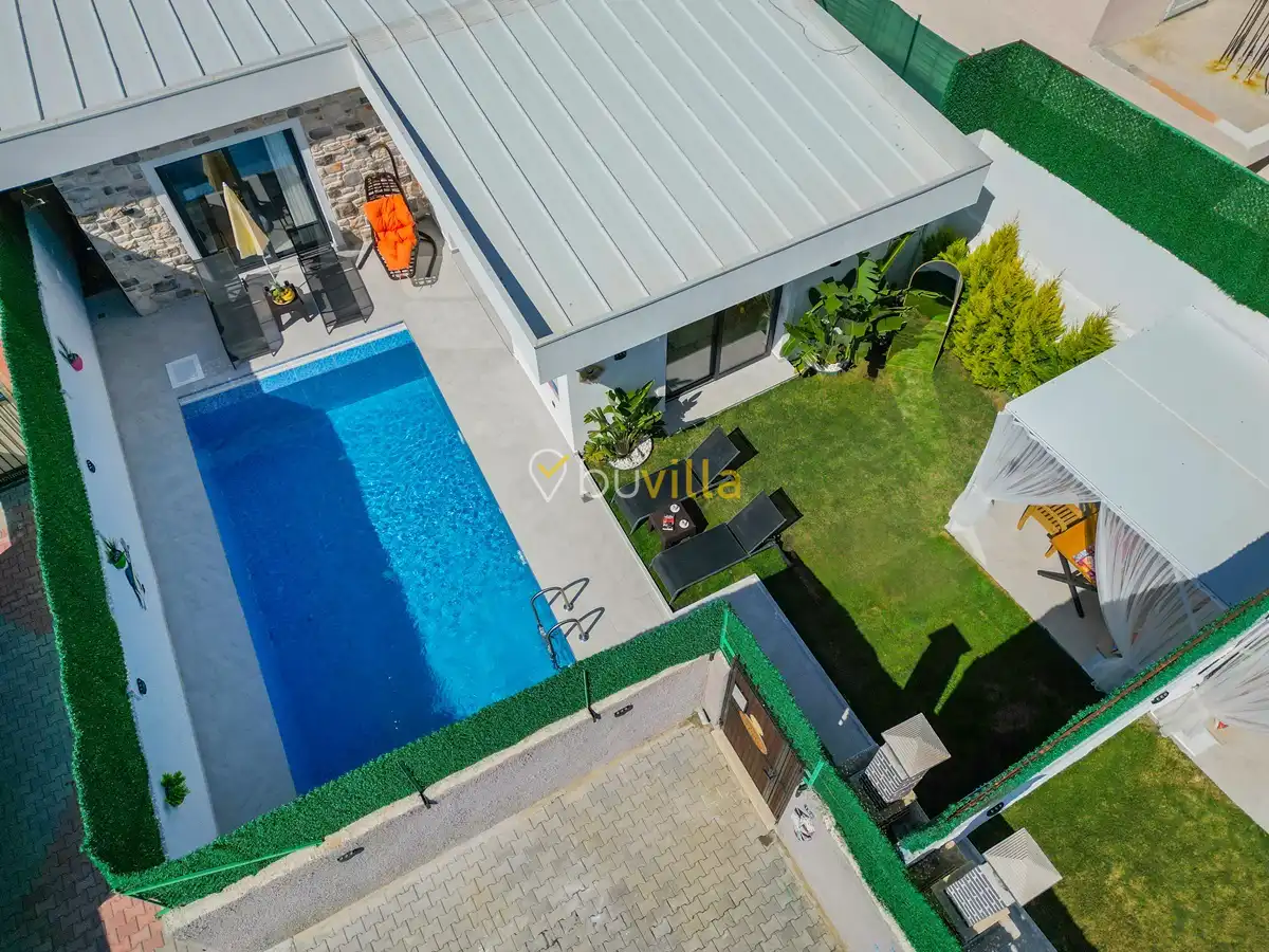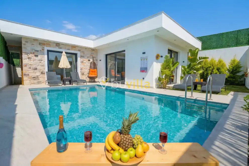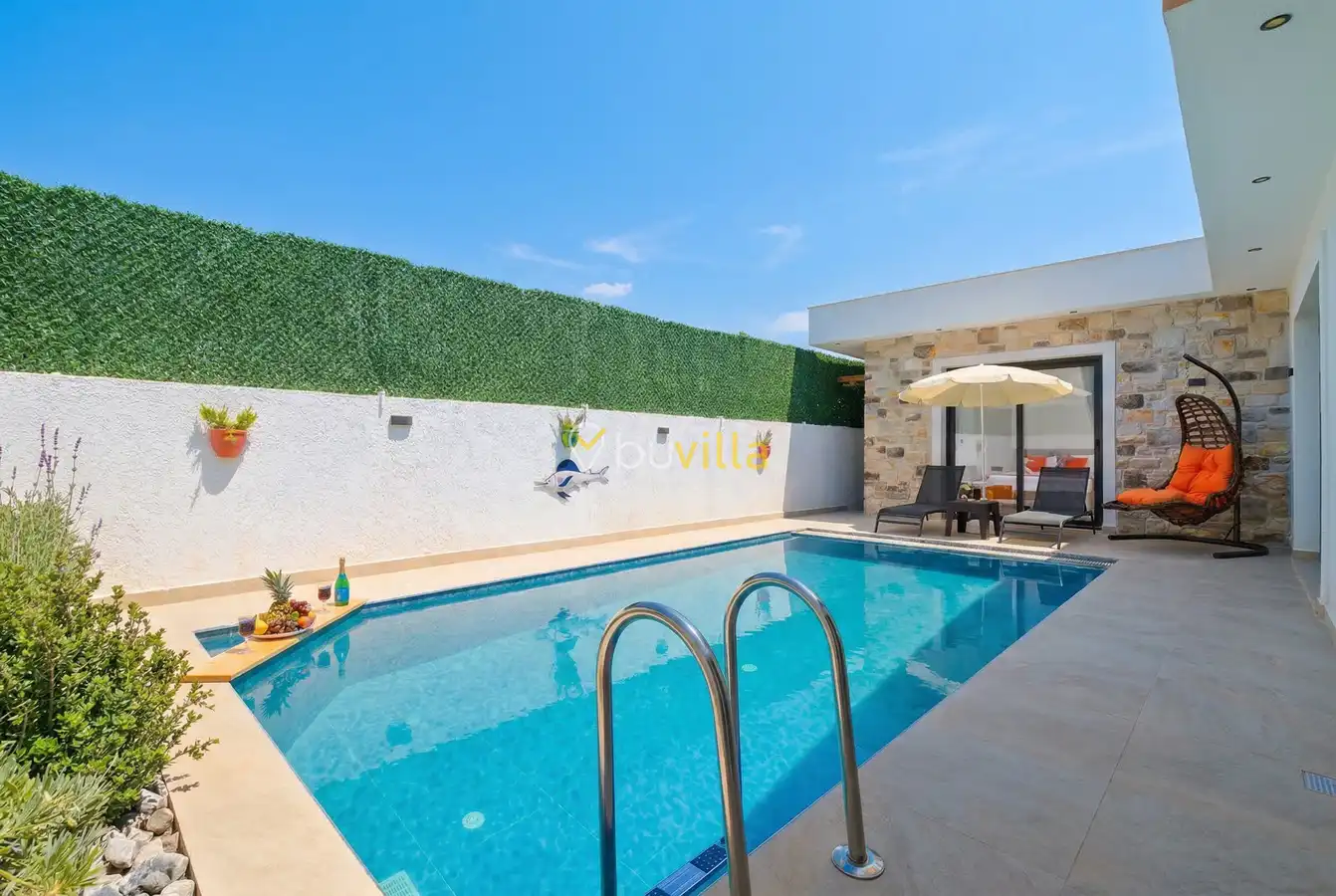 Fethiye / Karaçulha mevkiinde konumlanan bu konfor odaklı villa, 2 yatak odası ve 4 kişilik konaklama kapasitesiyle çekirdek aileler ve balayı çiftleri için ideal bir tatil seçeneği sunar. Dışarıdan görünmeyen özel havuz alanı, misafirlerine yüksek düzeyde mahremiyet sağlarken; jakuzili süit yatak odası ve modern tasarıma sahip yaşam alanları konforu üst seviyeye taşır.