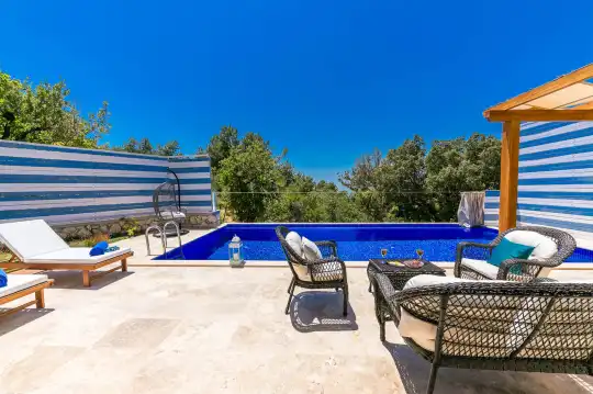 Muhafazakâr Villa Kiralik Villa Sunset 3 Kalkan islamlar mevkiinde 1 yatak odali 2 kisi kapasitesindedir. Kiralik villamiz balayi çiftlerine özel dizayn edilmistir. Konforlu dizayni ile göz dolduran kiralik villamiz kapali bahçe alani ile muhafazakâr villa tercih eden balayi çiftlerimiz için uygundur. Doga ile iç içe olan kiralik villamizda masa tenizi bulunmaktadir. kus civiltilari içerisinde size muhtesem balayi tatil firsati sunmaktadir. Not: Villamizin hemen yaninda Villa sunset 1 ve 2 de yer almaktadir, böylelikle kalabalik aileler ve arkadas gruplari için ideal bir seçenektir.