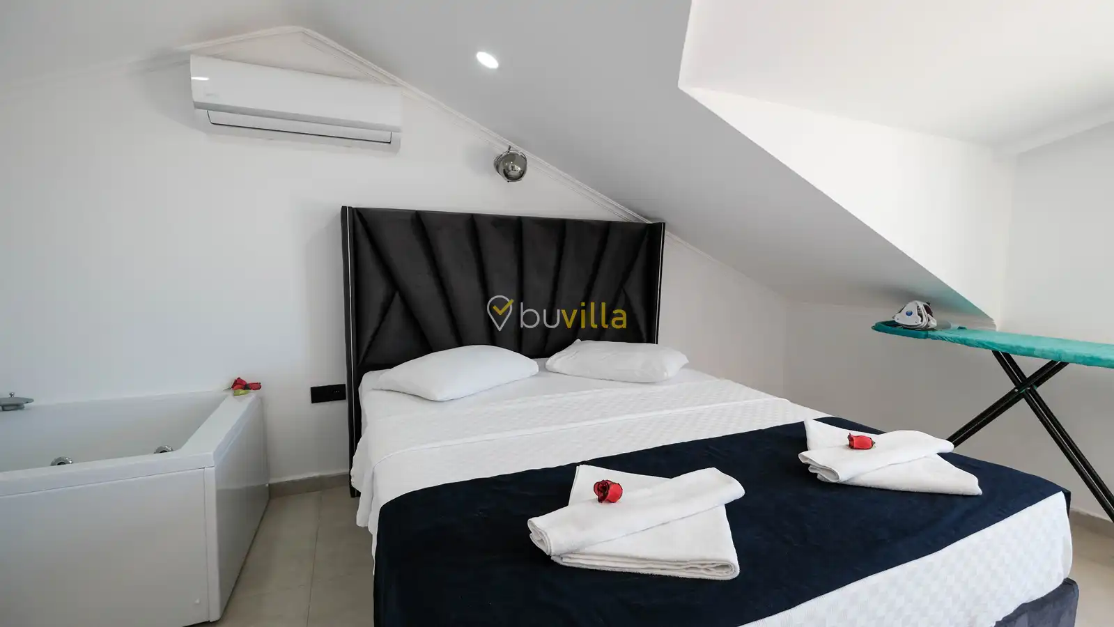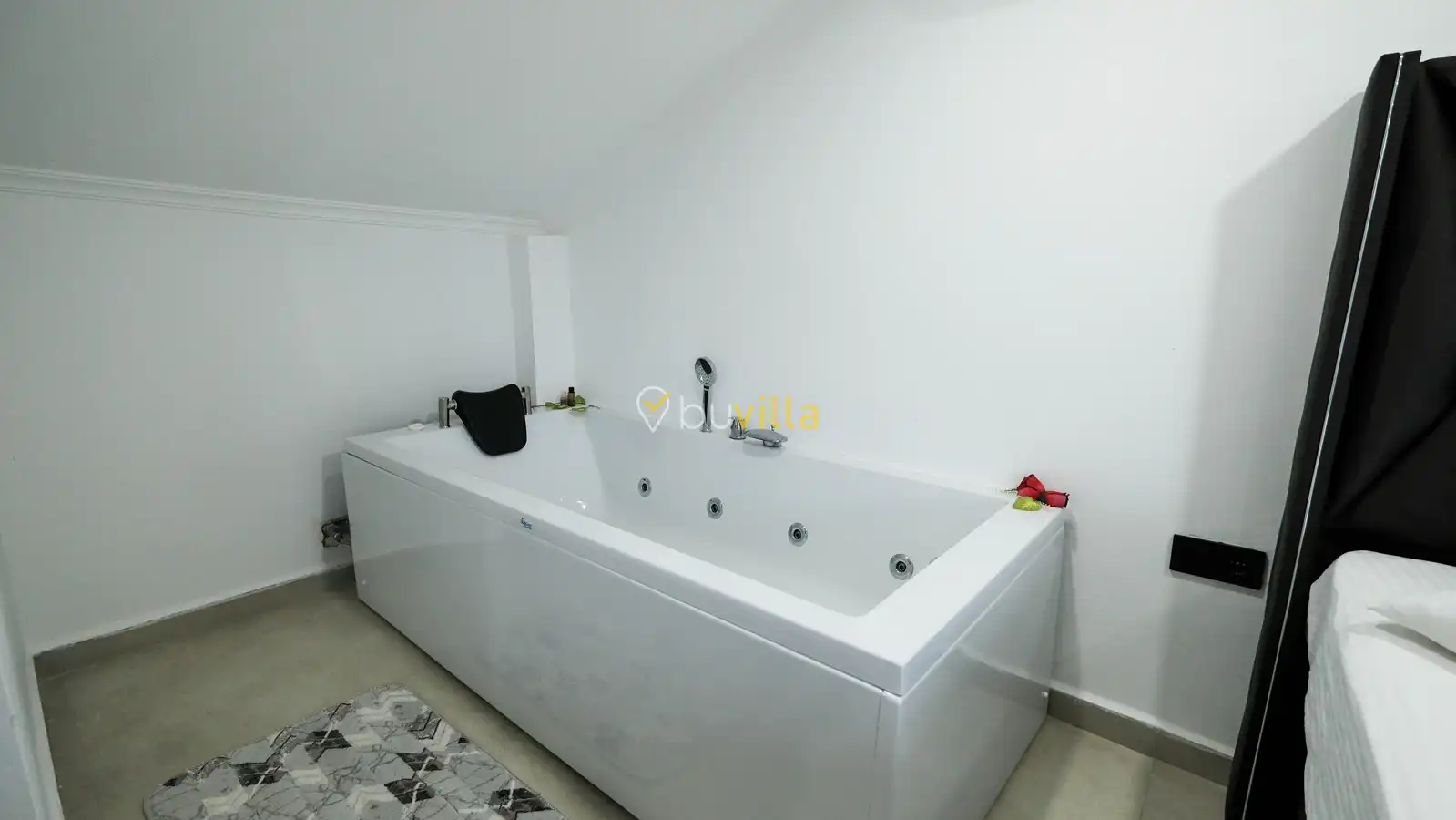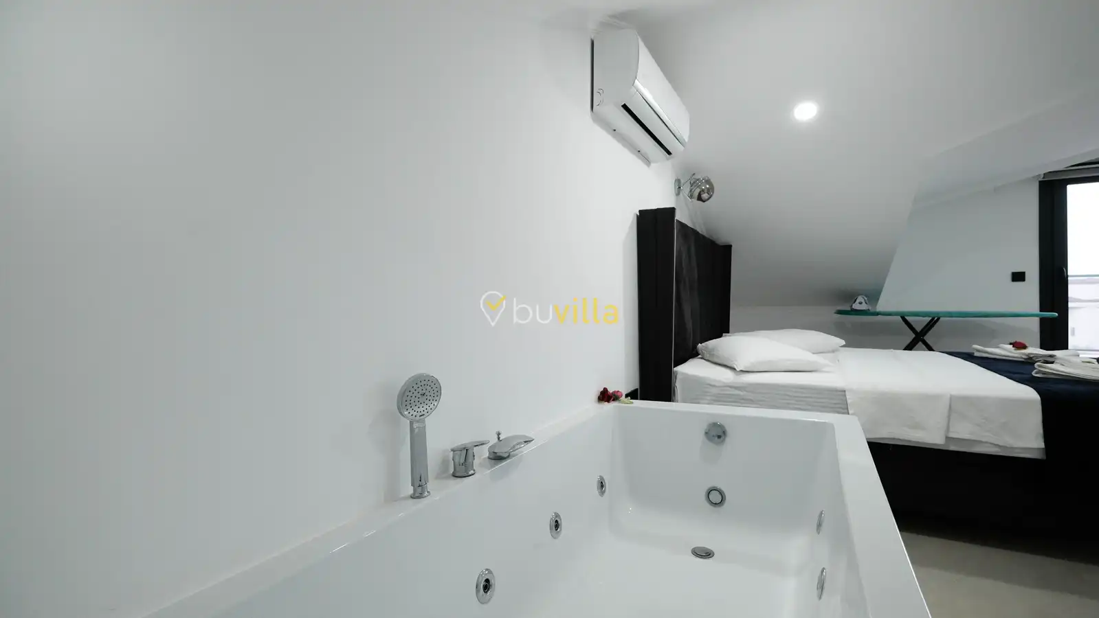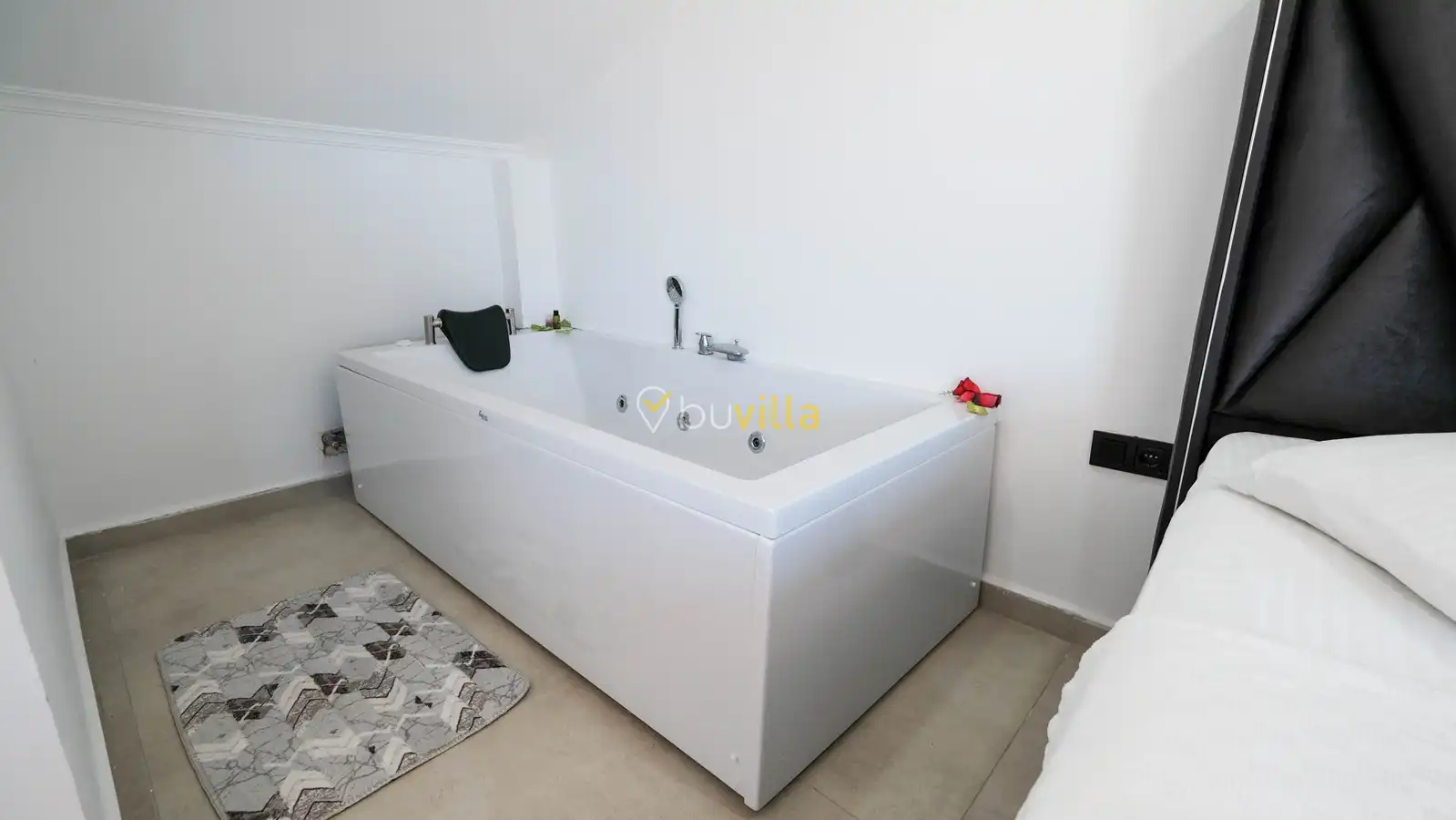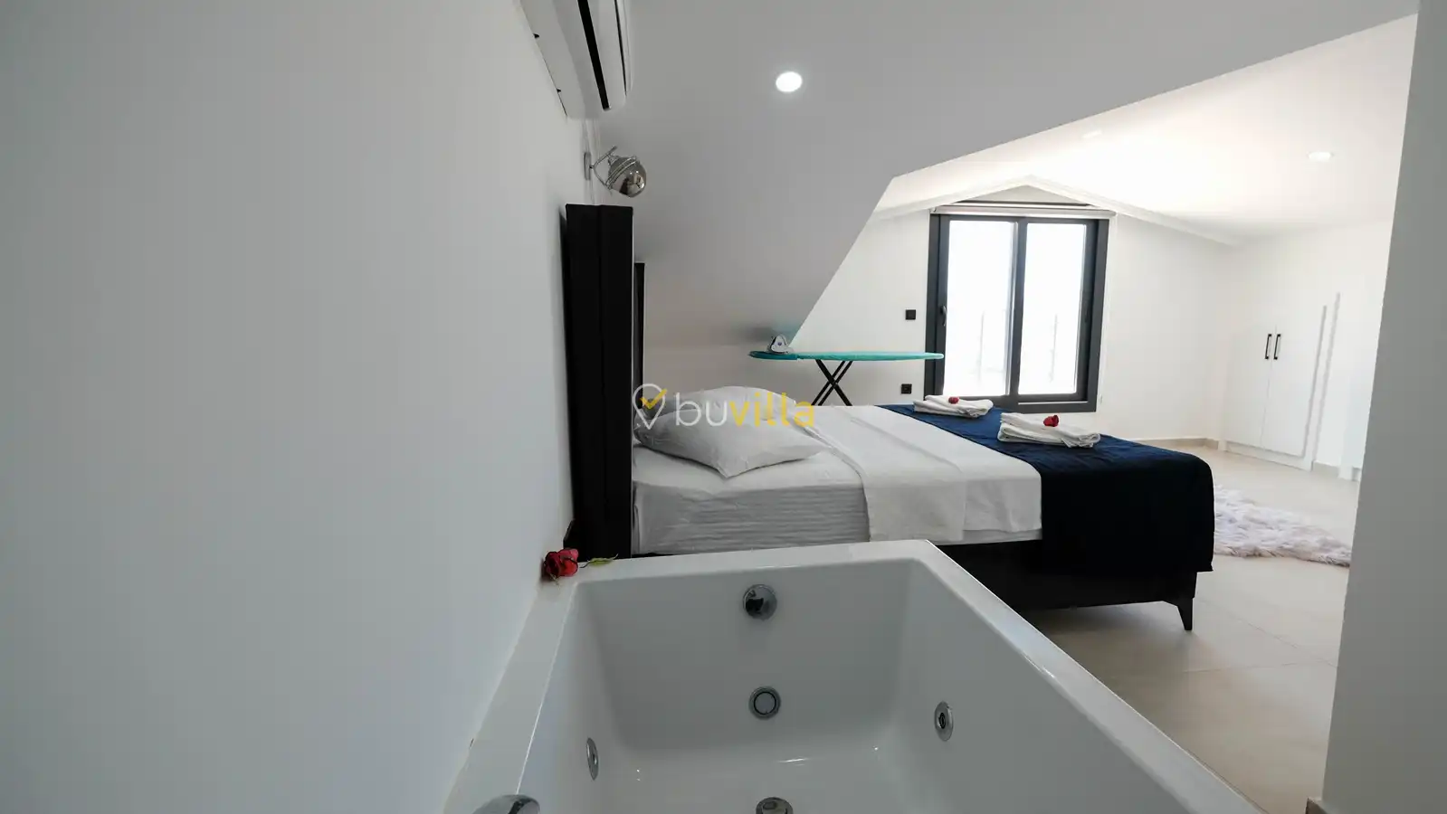 Modern ve konforlu bir tasarıma sahip olan villamızın ana yatak odasında çift kişilik jakuzi yer almakta olup, misafirlerine rahatlatıcı ve keyifli bir tatil deneyimi sunar. Geniş bahçesi, özel havuzu ve ferah yaşam alanlarıyla unutulmaz bir tatil fırsatı sunan villamız, tatilinizi keyifle geçirmeniz için tüm detaylar düşünülerek tasarlanmıştır.