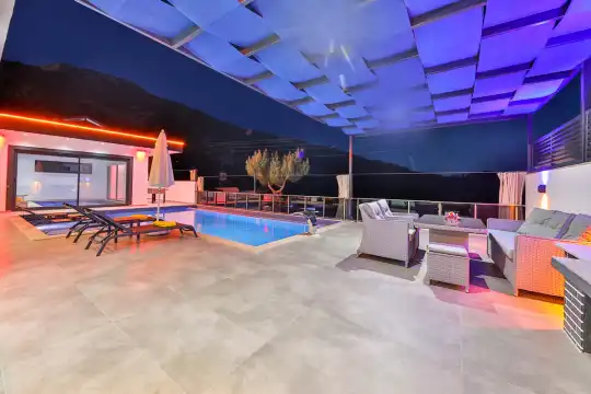Doga Manzarali Villa Kiralik Villa Tyra, Kalkan Islamlar bölgesinde yer almakta olup 2 yatak odali 4 kisi kapasitelidir. Doga içerisindeki kiralik villa lüks dizayni ile göz doldurmaktadir. Ihtiyaç duyabileceginiz tüm ekipmanlar bulunan kiralik villamizin içerisinde kapali isitmali havuz, hamam ve sauna yer almaktadir. Muhafazakâr aile ve arkadas gruplarina uygun olan kiralik villamizi balayi çiftlerimiz için de ideal bir seçenektir. Keyifli tatil firsati sunan kiralik villamiz misafirlerini agirlamayi beklemektedir. Not: Kapali havuz isitmasi 1 Ekim - 30 Nisan tarihleri arasi toplam tutara dahil olup diger aylarda talep edildigi taktirde günlük ekstra 1500TL karsiligi aktif hale getirilmektedir