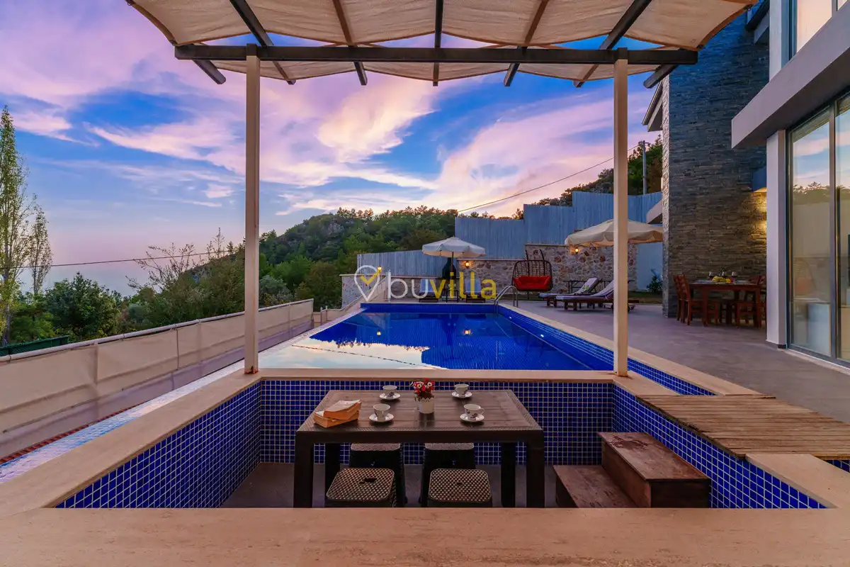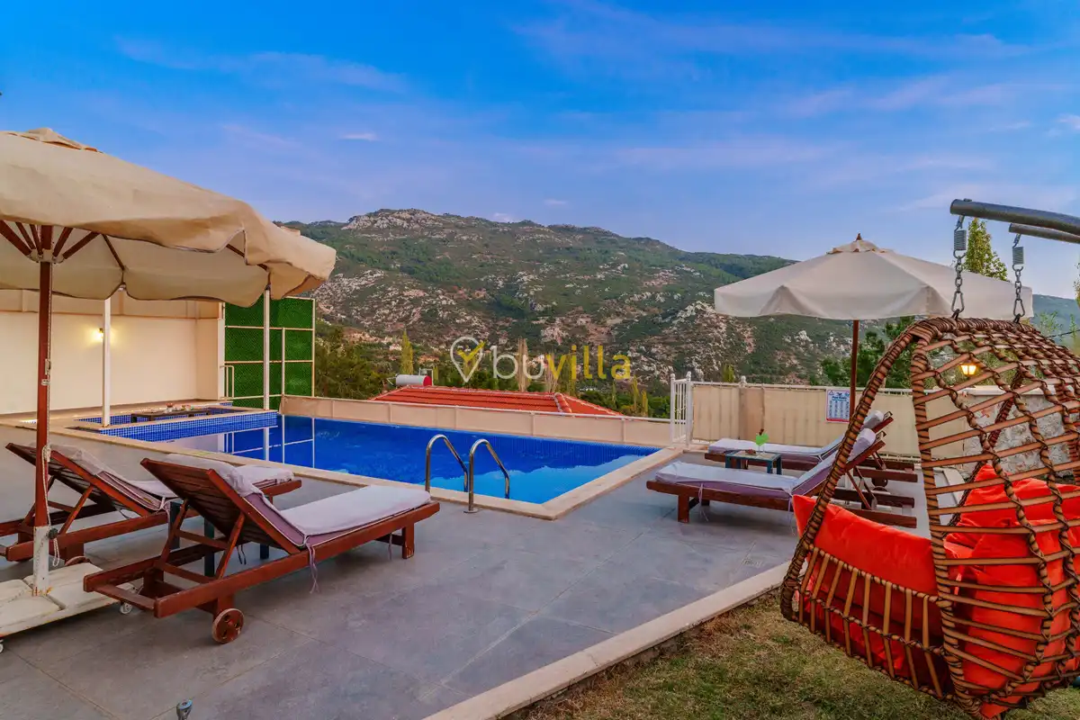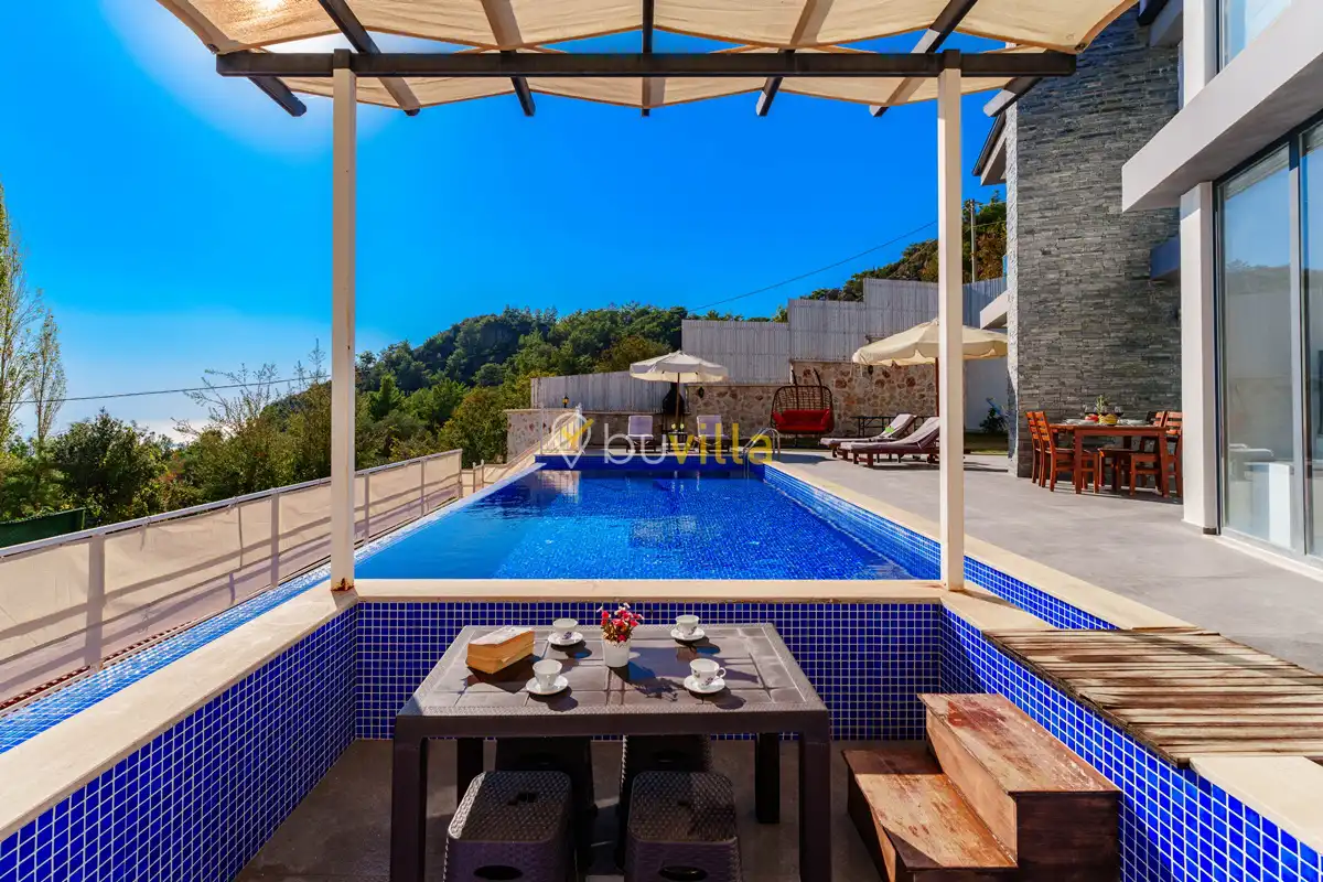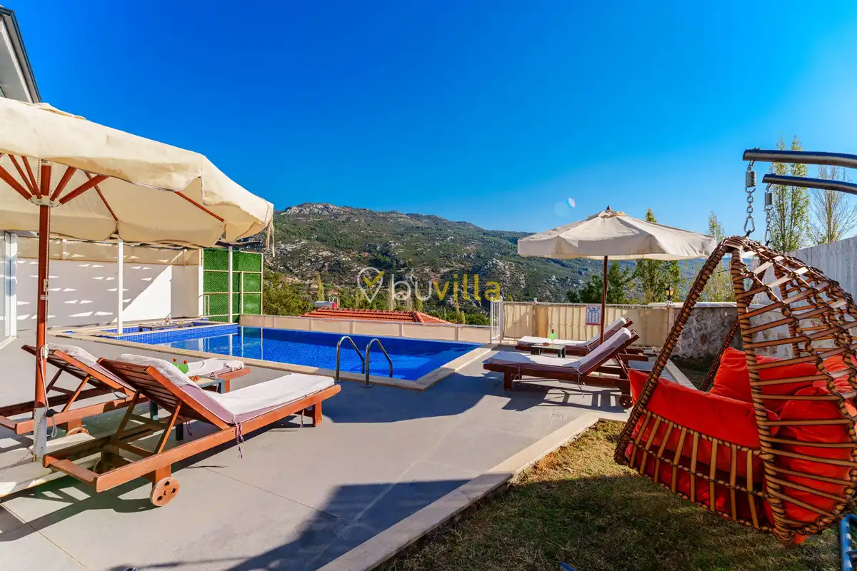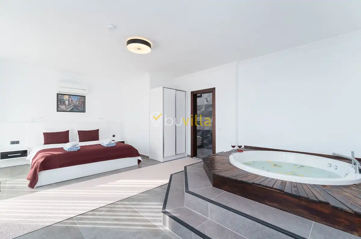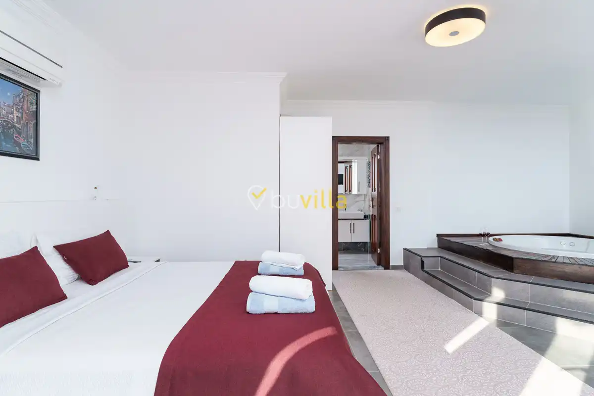 Villanın özel yüzme havuzu, dışarıdan görünmeyecek şekilde konumlandırılmış olup mahremiyete önem veren misafirler için rahat bir kullanım sunar. Yatak odalarından birinde bulunan jakuzi, tatilinize keyifli ve dinlendirici bir ayrıcalık katar.