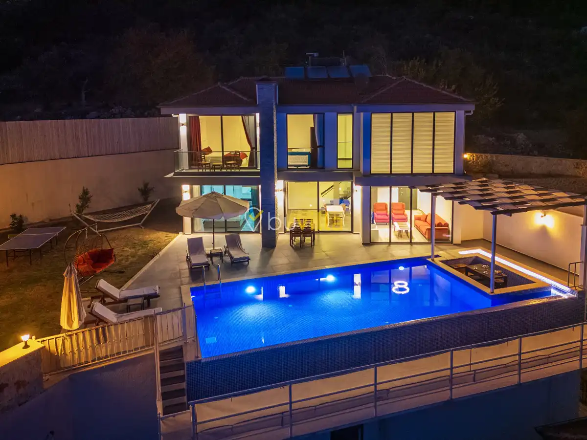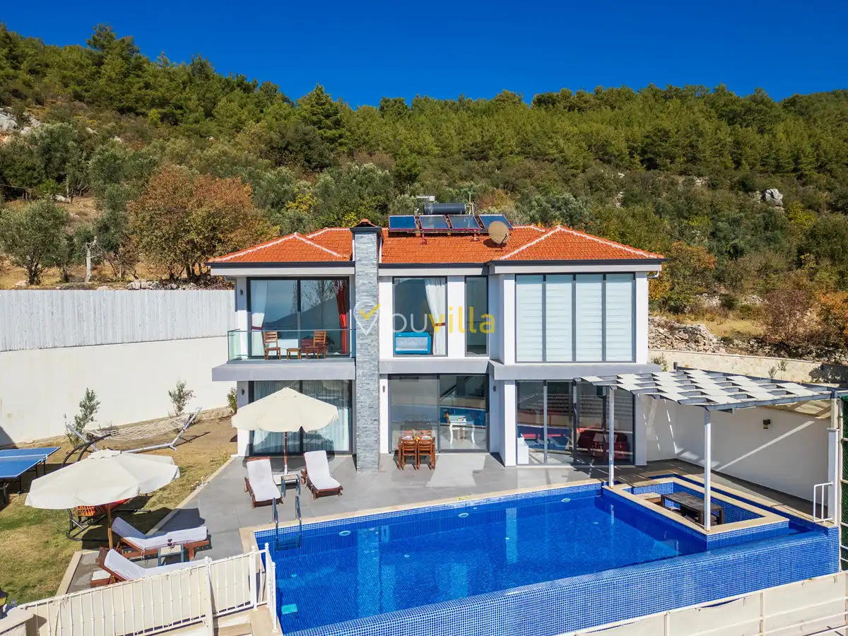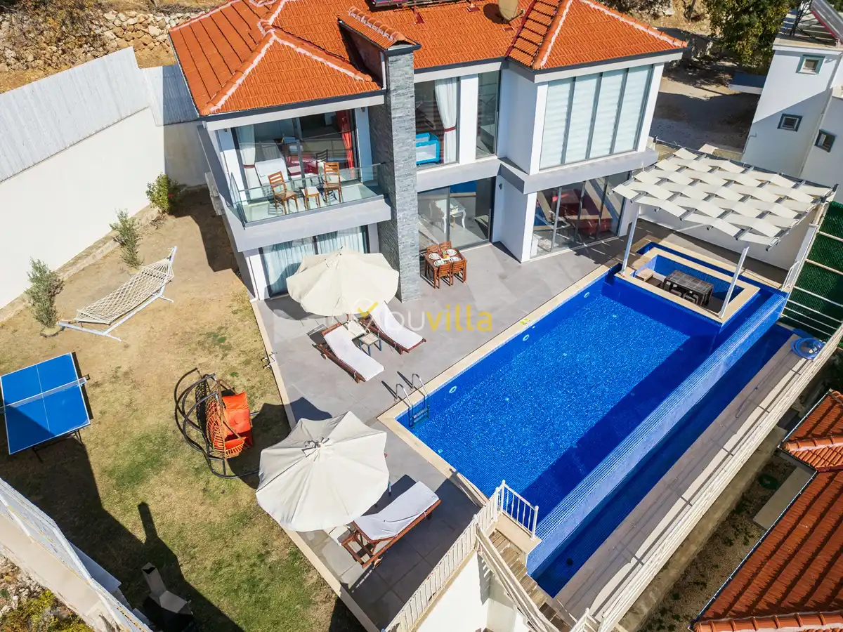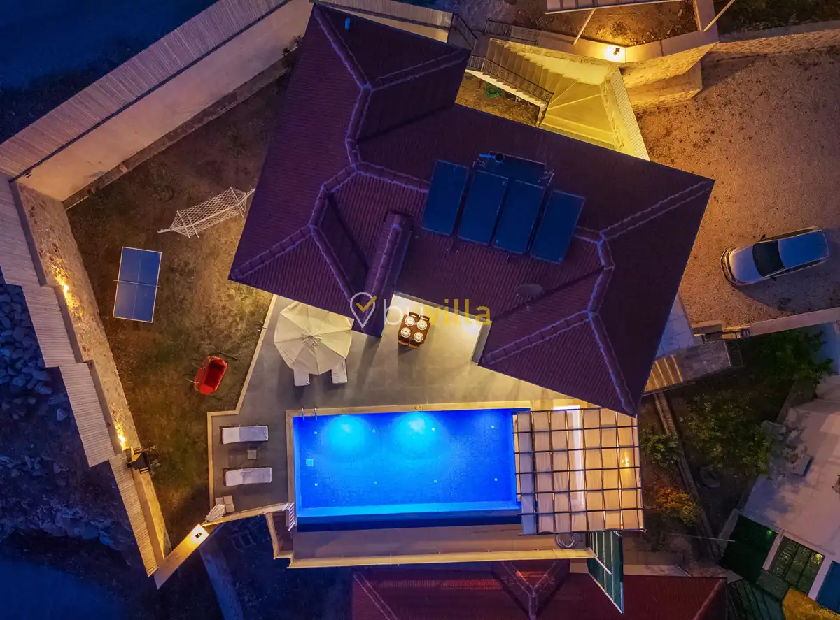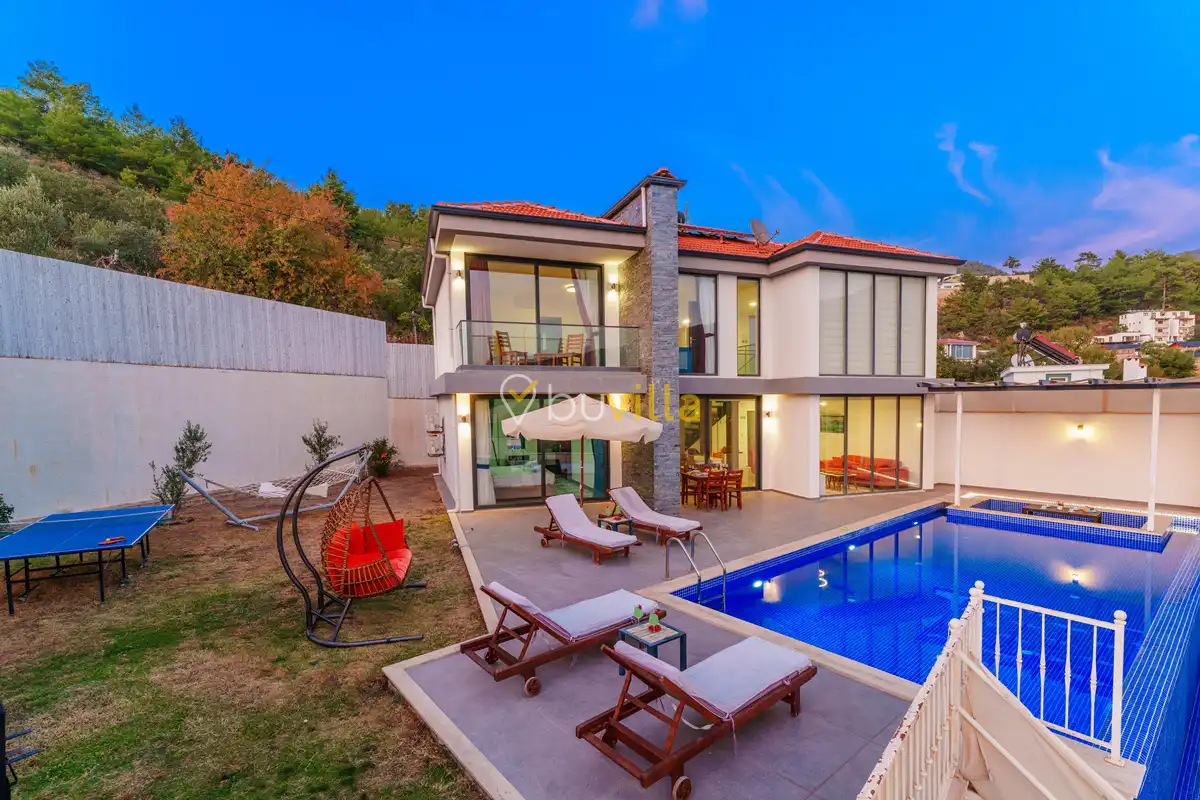 Villanın özel yüzme havuzu, dışarıdan görünmeyecek şekilde konumlandırılmış olup mahremiyete önem veren misafirler için rahat bir kullanım sunar. Yatak odalarından birinde bulunan jakuzi, tatilinize keyifli ve dinlendirici bir ayrıcalık katar.