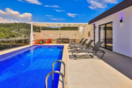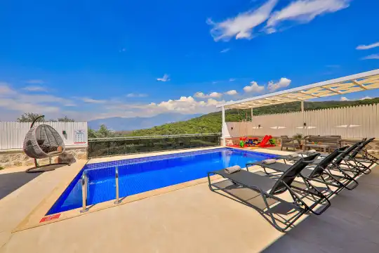 Kalkan Patara mevkiinde konumlanan doga manzarali bir balayi villasidir. 2 yatak odali olan villamiz toplamda 4 kisiye kadar konaklama hizmeti saglamaktadir. Yazligimizin Amerikan mutfaginda gerekli tüm ekipmanlar mevcut olup, konforlu mobilyalar ile dizayn edilmis salonu hizmetinizdedir. Ayrica villamizin bahçesinde çocuklu aileler için eglence parki bulunmakta olup balayi çiftleri, çekirdek aile ve çocuklu aileler için ideal bir seçenektir
